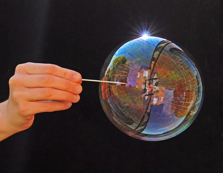 “A really important tip is to have a dark background behind the bubble, because the background brings out the color of the bubble. A bright background, by contrast, makes the bubble look transparent. Another tip is to blow a few bubbles before taking the photograph. The first bubbles to come off the bubble wand are really wet, which produces a thick film to the bubble. Different film thicknesses create different colors, with the thinner films being more vibrant blues and yellows. I love the blues and pinks that come with a thin film. A bright sunny day also makes for beautiful light patterns in the bubble, because the sun can create bright spots and lines. You should be careful with the sunlight though, because the spots are very bright and could reflect into your eyes.”