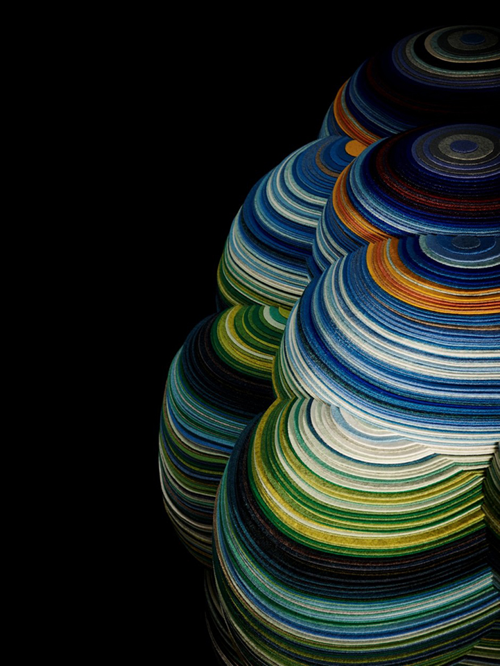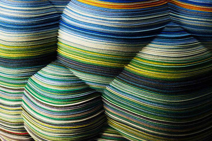 The unique concept is composed of 545 pieces–more than 2,700 feet–of colorful Divina fabric by Kvadrat, Europe's leading manufacturer of design textiles. The material is 100% wool, but it has a smooth surface similar to felt. Hutten drew the shapes and cut the fabric for the final design with a CNC machine, and then manually assembled the chair using 100 unique colors. He used the fabric as the central focus of the piece, stating “I wanted the design to be about the textile. Rather than using the material as a cover, I created an object with the material.”