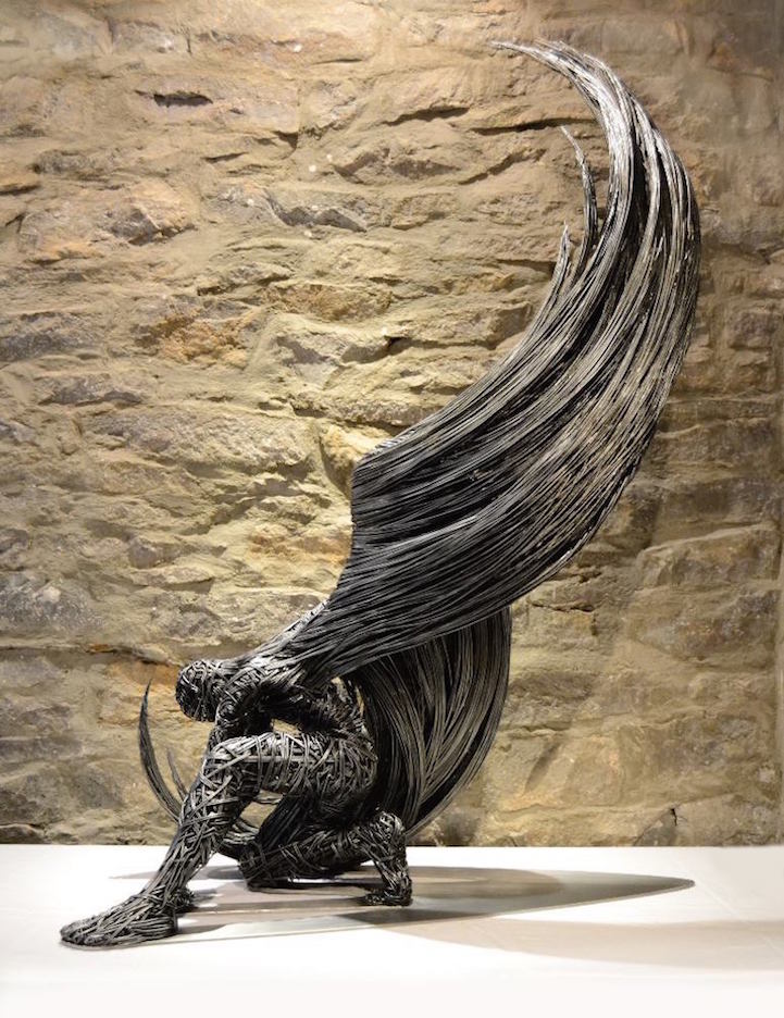 Stainthorp has created these alluring artworks for almost 20 years. They don't have any facial features, but through their body language, we understand their emotions. Some look as though they're falling and communicate a feeling of freedom or infinite possibility. Another sculpture has a breathtaking set of wire “wings” that appear as its shield. To think that Stainthorp articulates all of this through something as ubiquitous as wire is incredible.