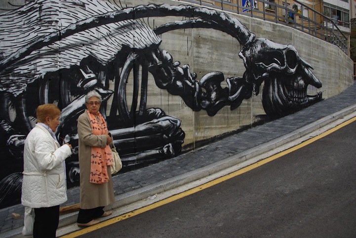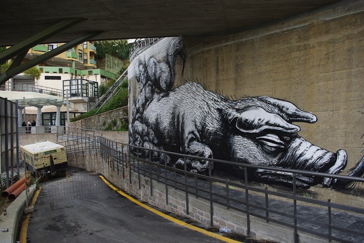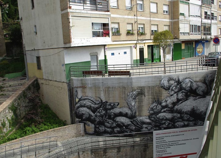 It almost seems like ROA hasn't taken off any time this year. Of course, we couldn't be happier because we admire his street art so much. This time, he takes on an unusual canvas, a curving wall in Santander, Spain. ROA fills the large scale mural with his trademark animals and fossils, who appear to be sleeping. Always incredibly detailed and powerful, Roa's art consistently amazes us.
