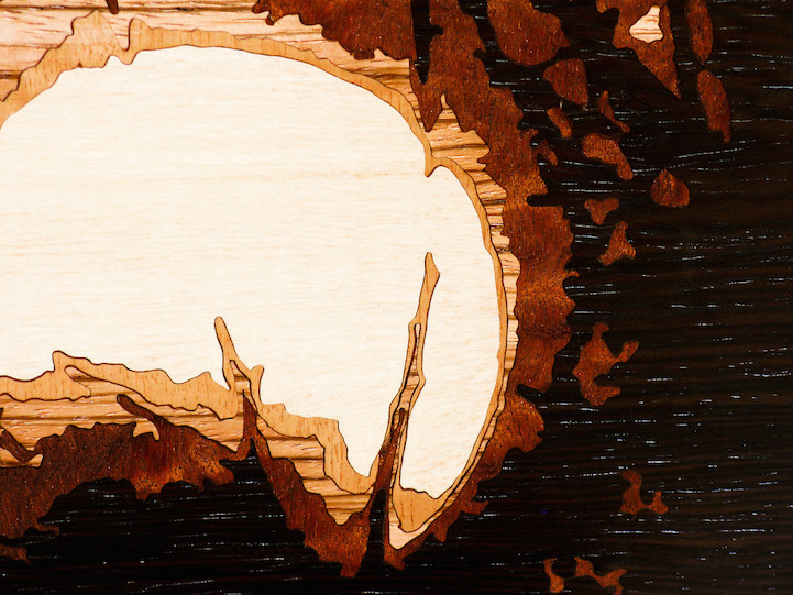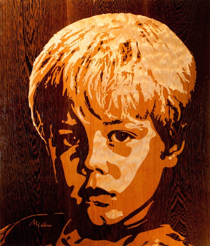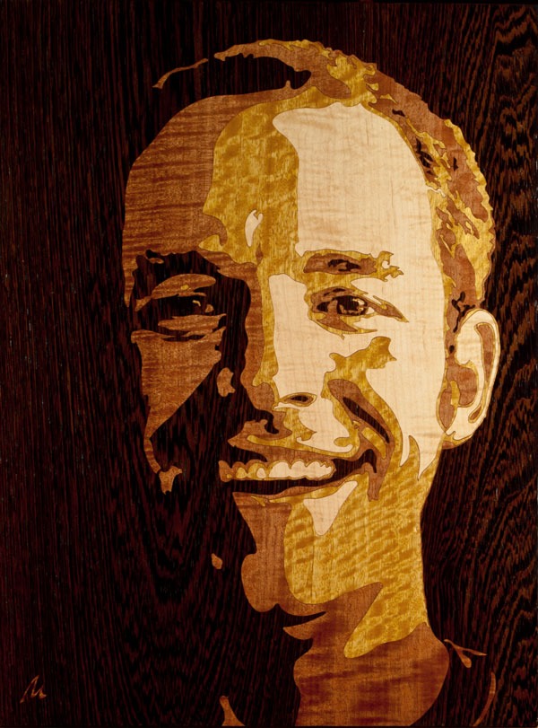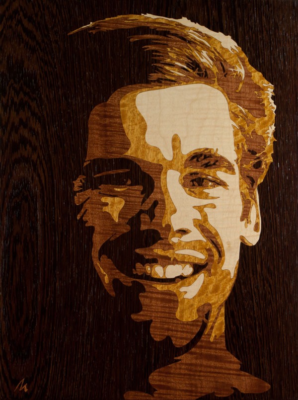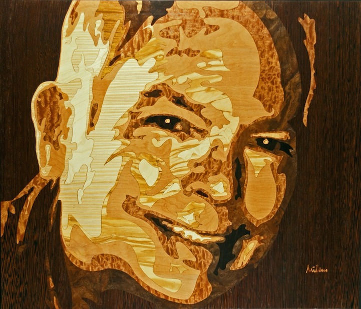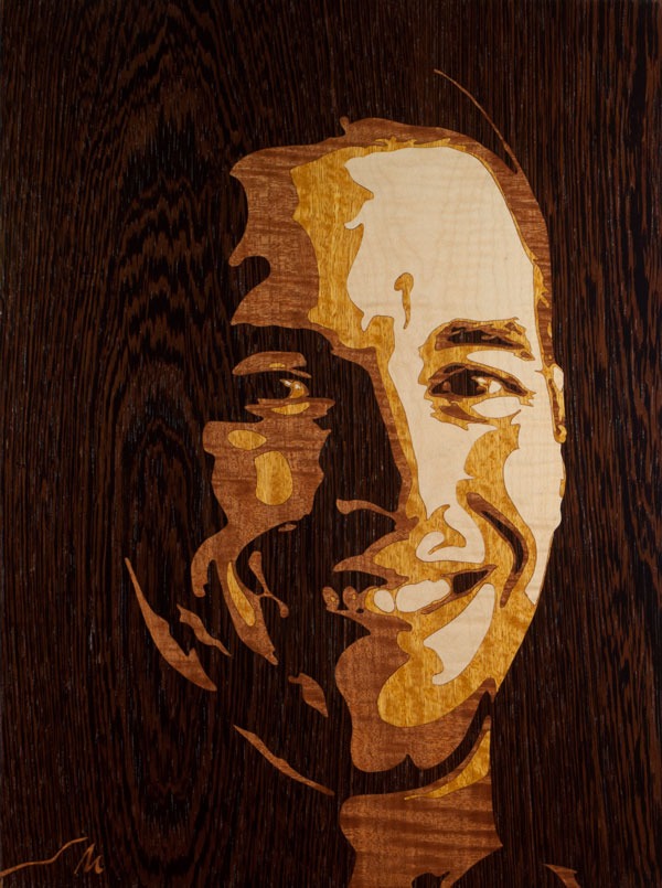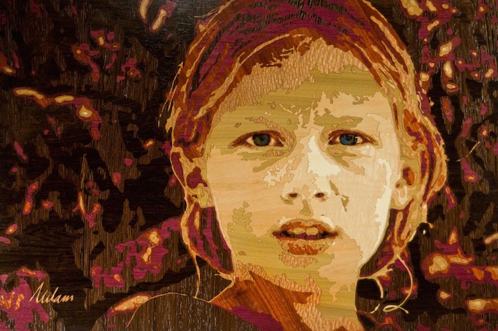 Every type of wood has a distinctive grain and color, ranging from creamy white, to darker browns, and even black. Milam works with all of them. He'll sometimes accent his portraits with artificially-colored blue and green veneer as a way to place emphasis on a subject's eyes. This gives his pieces visual variety and depth in ways you wouldn't normally expect with wood.