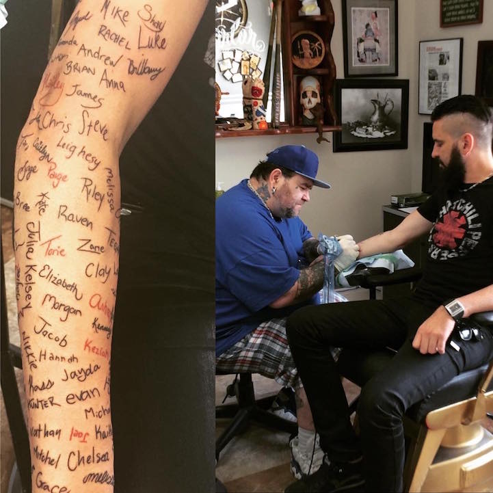 Nash himself is no stranger to the feelings of loss and despair—as a teen, he barely survived a car crash. He recovered, but was forced to stop playing the sports he loved. “I was in this really dark place emotionally where I didn’t want to be alive,” Nash recalled. “Everything you had planned out in life was stripped away.” Now, the musician and his bandmates go to schools and detention centers to present on this often-taboo topic. After one of his inspirational talks, a girl approached him and handed him a suicide note. “She was planning to take her life that weekend,” Nash told BuzzFeed. But now, the note was no longer necessary. He’s collected more than 500 of them over the past five years and recently decided to permanently honor 120 of his brave fans by tattooing their signatures onto his right arm.