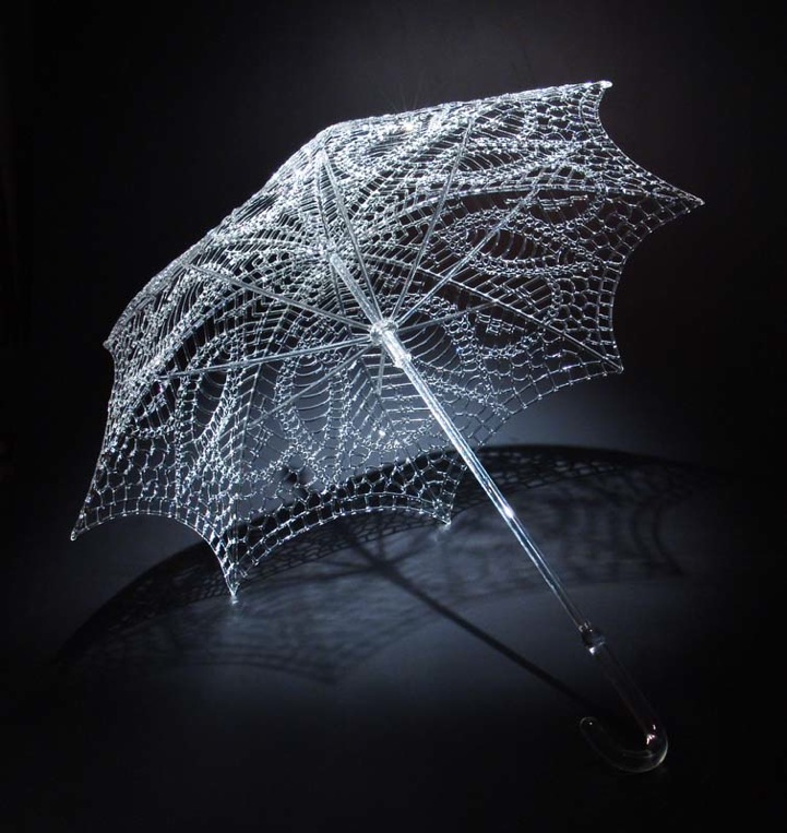 Mickelson's work emulates objects just as well as the human form. Looking through his portfolio, I noticed that the artist appears to have a fascination with recreating various heavy-duty firearms, applying his signature mesh pattern. I think it's equally fascinating as a viewer to take in not only the intricate detail of the “weapons” but the irony of the replicated tool's purpose versus the sculpture's physical strength. Glass can easily shatter, making them the most delicate guns I've ever seen.