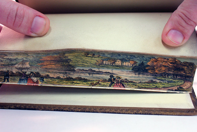 Special Collections Librarian Colleen Theisen recently uncovered a fore-edge painting found on a scientific book from the early 19th century. The book is from a set of four volumes about the seasons by Robert Mudie that were donated to the Special Collections & University Archives at the University of Iowa by Charlotte Smith, each one holding a hidden image on the edge of its pages. Upon its discovery, Theisen promptly created a gif of the secret painting on the Autumn book.