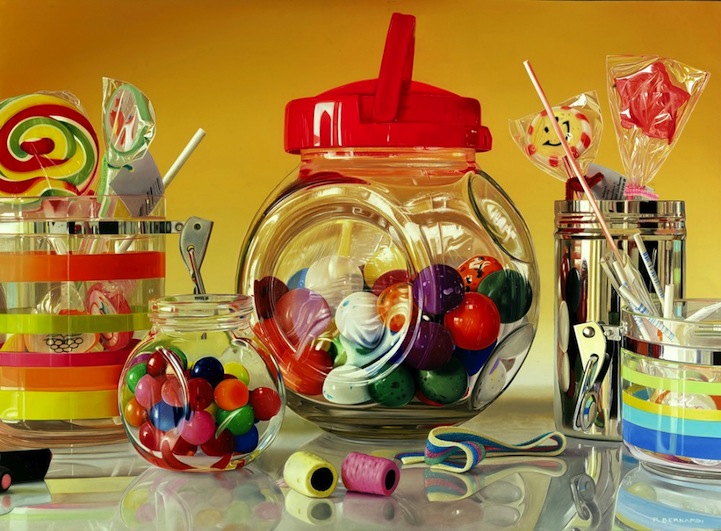 Since a very young age, Bernardi has been a painter. He has dabbled in all kinds of work, including landscapes and portraits, but ultimately the artist's talents are most obvious and incredibly magnified when he creates this hyperrealistic style. Each still life, which boasts a variety of treats like old fashioned candy sticks, jelly rings, lollipops, candy canes, and bubblegum, features the glossy reflections of candy on the countertop, the crinkles of cellophane wrapping around lollipops, and even the fine touches of sugar crystals covering the surface of the jelly candies. Bernardi pairs each painting with interesting titles like Lights and Shadows, Candy Rainbow, Two Lights, and Ship of Desire, which suggest both the style in which he paints as well as the colorful and yummy subjects that he features. After seeing this work, don't be surprised by the sudden craving for something sweet.