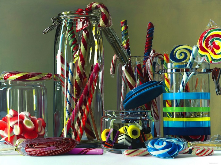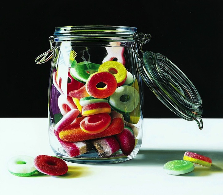 Anyone with a sweet tooth will instantly love this work by Italian artist Roberto Bernardi. Viewers will be shocked by the collection of candy still life images when they learn that these aren't photographs, they are actually hyperrealistic oil paintings on canvas. The delicious details are astonishing and it's hard to believe that these images aren't recorded with a camera.