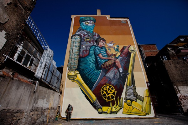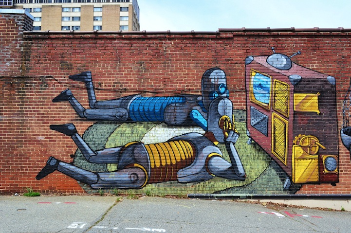 Turin, Italy-born Pixel Pancho has an unmistakable style, he paints whimsical robots on the streets. Unlike many street artists he has a formal background in art studying at the Academy of Fine Arts in Valencia, where he obtained his degree. His style is influenced by past painters such as Joaquin Sorolla and Salvador Dali as well as more current artists like Ron English and Takashi Murakami. His love for graffiti has taken him all around the world where he's painted huge robot-filled murals in places like Paris, Amsterdam and Warsaw. A rising star in the street art scene, he's definitely one to watch.