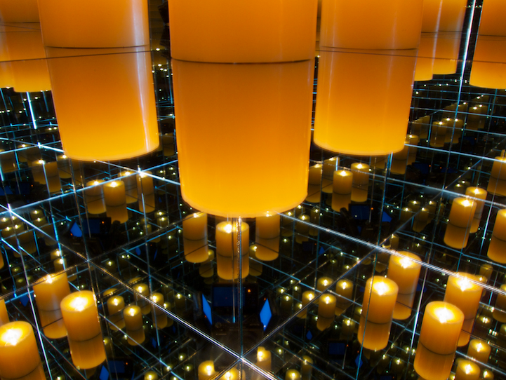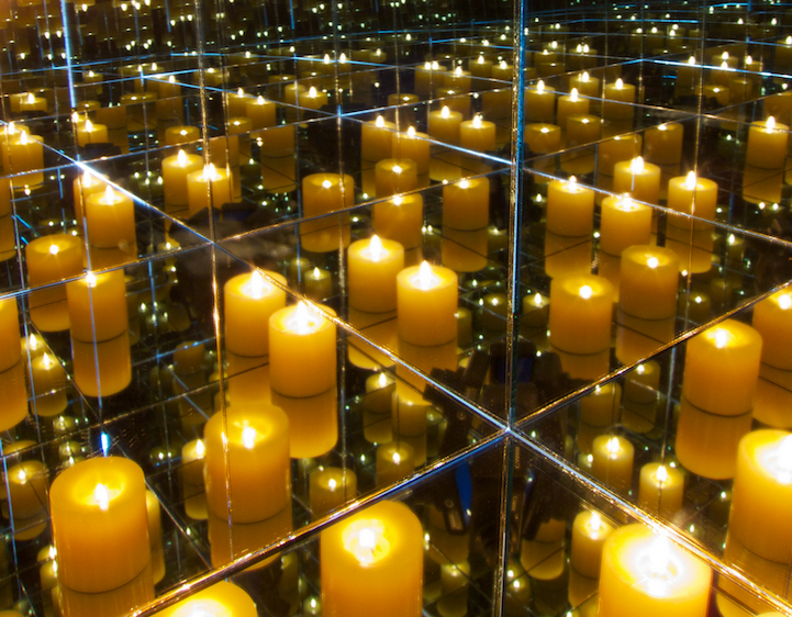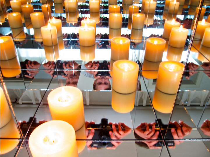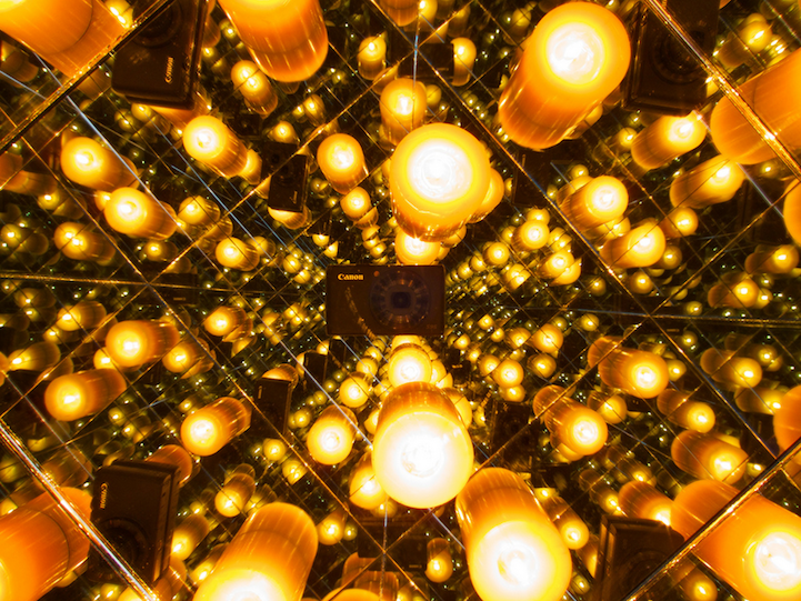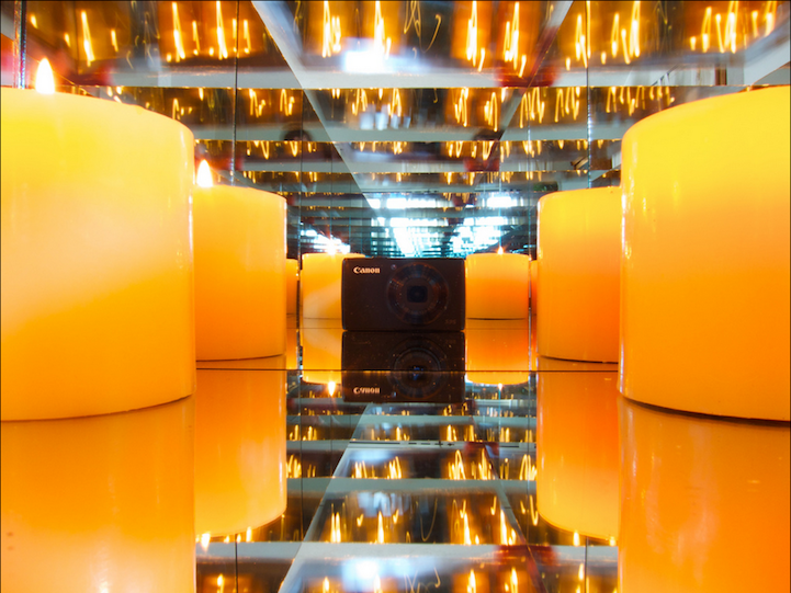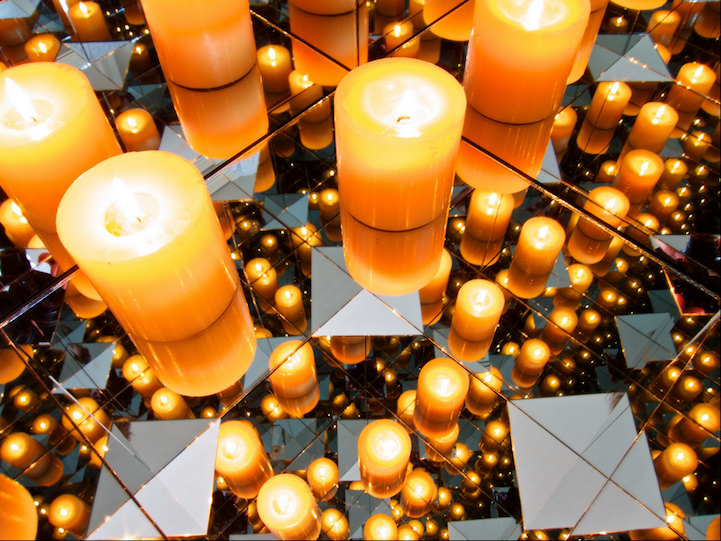 To document the effect without human interference, Brinkmann sets the timer on his camera, puts it inside of the box, and then places the final mirrored panel on top as a lid. In the final photographs, viewers will find themselves excited to explore the images in order to make sense of the endless reflections of glowing candles, balls of aluminum foil, or rows of C-3P0.