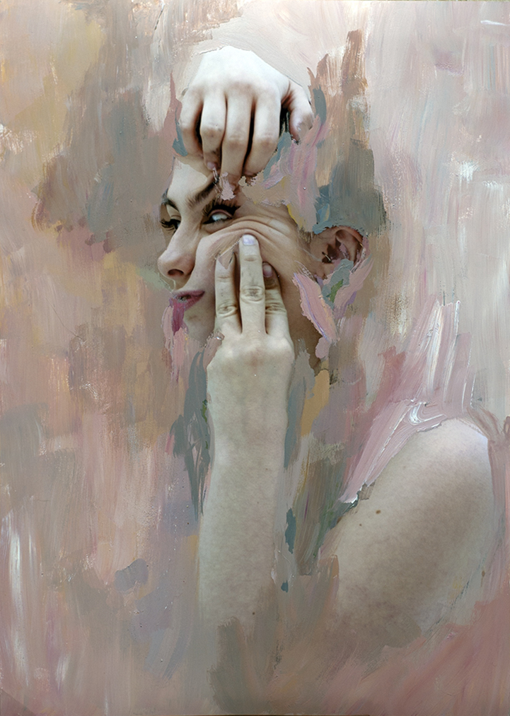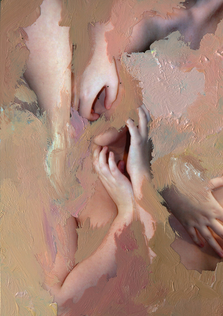 Each composition is a mix of paints layered on top of a digital photo collage. Jones works with a palette of pastels that blend with the subject's body. The striking colors and milky white skin merge together in a blur of alluring disfigurement.