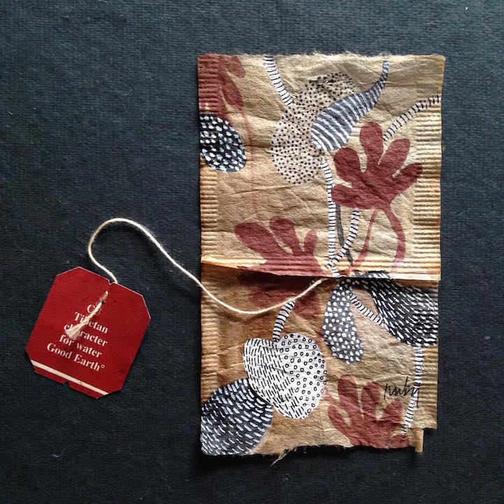 At the beginning of this year, visual artist and graphic designer Ruby Silvious embarked on a quirky, personal experiment, set to last for 363 days. She decided to repurpose soggy and stained tea bags as unconventional, blank canvases, just waiting to be filled with her artistic expression. The project, entitled 363 Days of Tea, allows Silvious to challenge herself by transforming the recycled material with her intricate illustrations–the artist draws, paints, and forms collages on the salvaged tea bags.