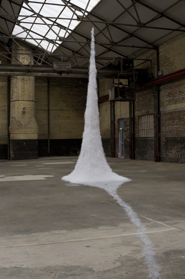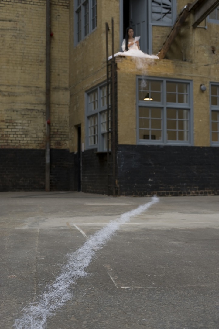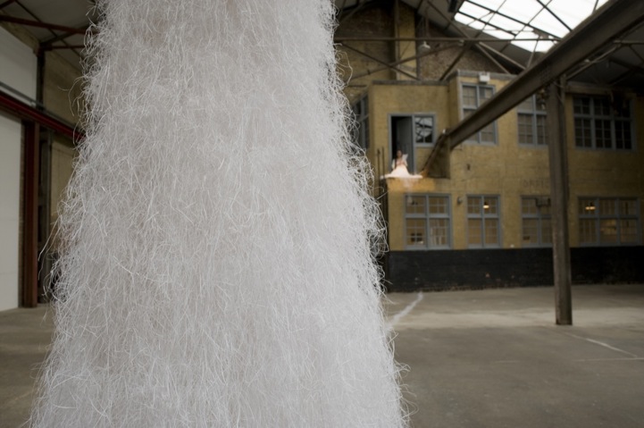 The performance artist's serene depiction has a strong element of surrealism that makes the spectator feel like they've entered into an alternate universe. There is a pillar of fine-cut paper that looks like a fuzzy icicle and makes it seem like we're all walking on the ceiling. From this tower, there is a trail leading to the artist, cutting away at her paper. Adding to the dreamlike effect of the live show, Abe's scissors are connected to speakers that amplify the cutting sound as you draw closer to the artist.