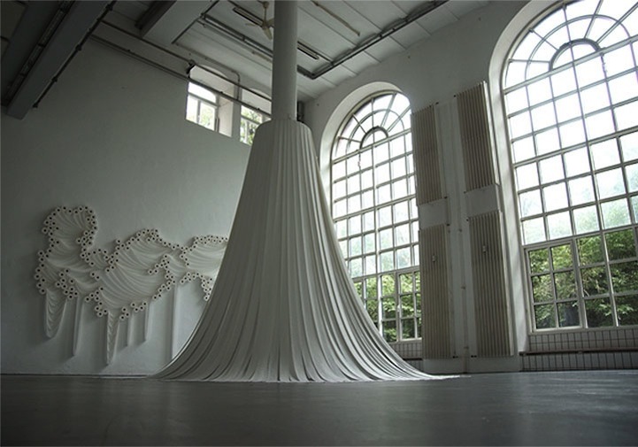 We've seen our share of amazing paper artists and even come across one that works with the discarded cardboard tubes of used toilet paper rolls, but now we're mesmerized by these beautiful installations by artist Sakir Gkebag that use rolls of toilet paper in their entirety. The series of sculptural works titled Trans-Layers incorporate hundreds of rolls of white toilet paper, configuring them into abstract designs against an ivory backdrop.