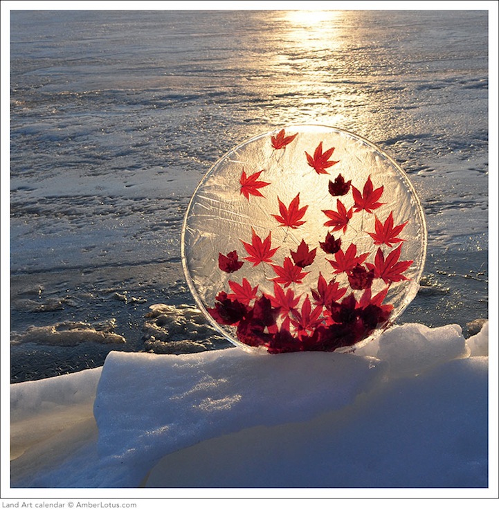 Sally J. Smith is an environmental artist who creates ethereal sculptures that illustrate the simple beauty of the natural world. Her works exist in complete harmony with their surroundings, as her materials she builds upon are found entirely on site. One sculpture shows red leaves frozen within a round circle of ice, while another is composed of sticks in the water, intentionally placed so that an illusion of a whole circle is formed.