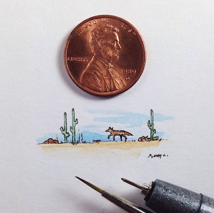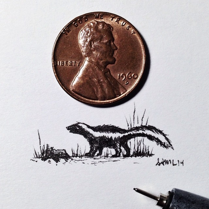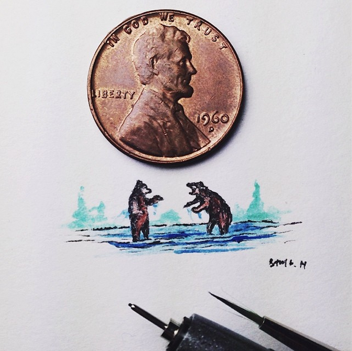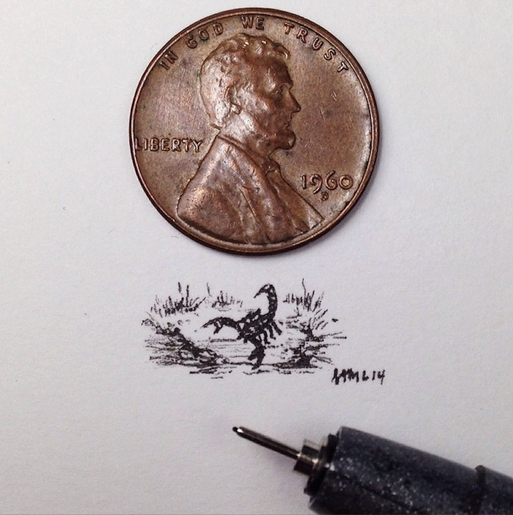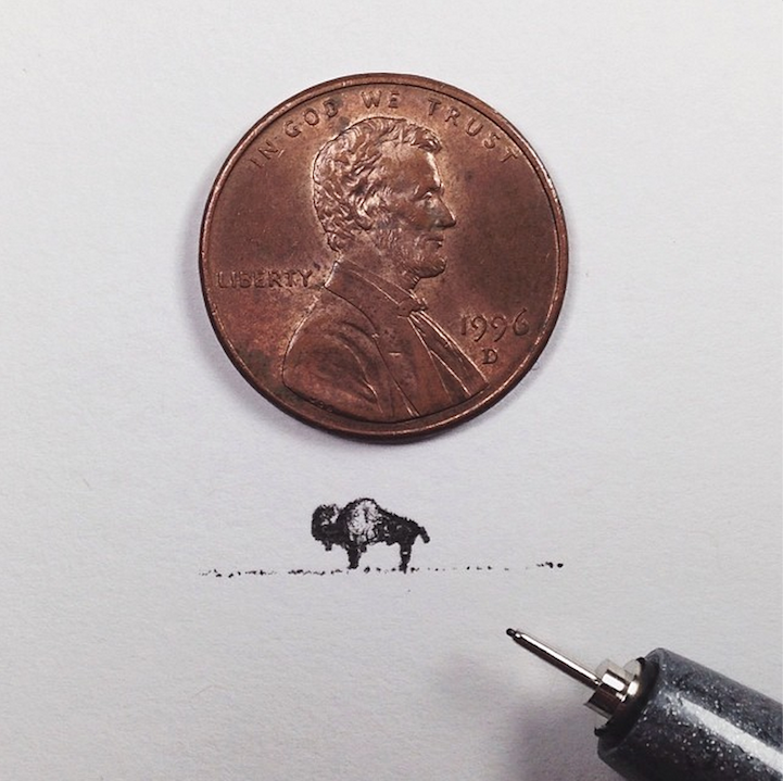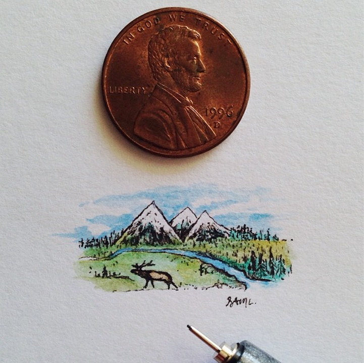 With incredible precision, California-based artist Sam Larson produces tiny illustrations that are no larger than a penny. To prove it, he places a penny right next to the drawings and documents them on Instagram.