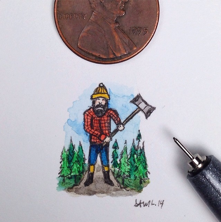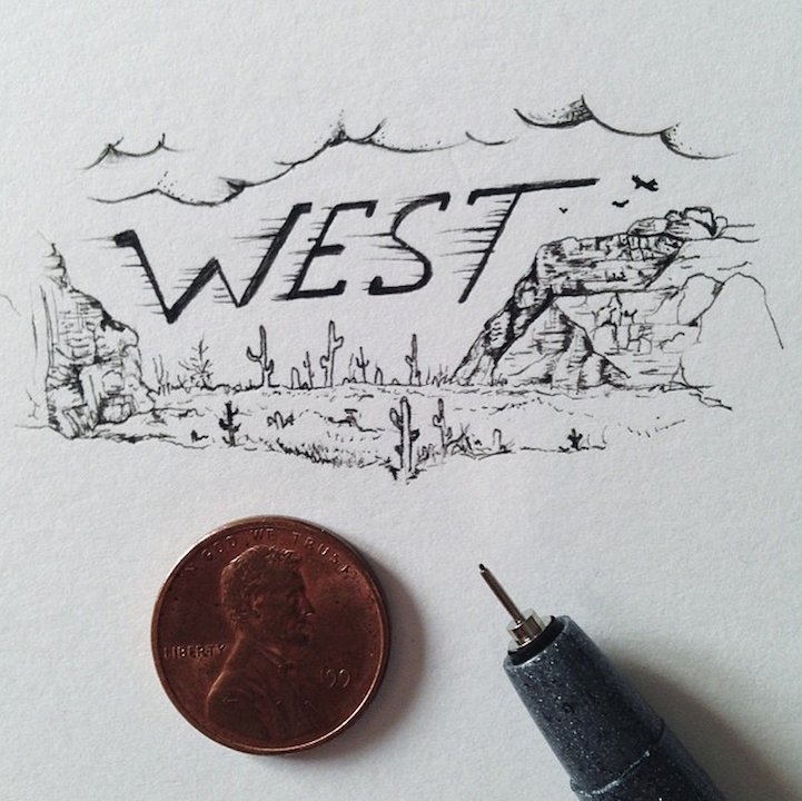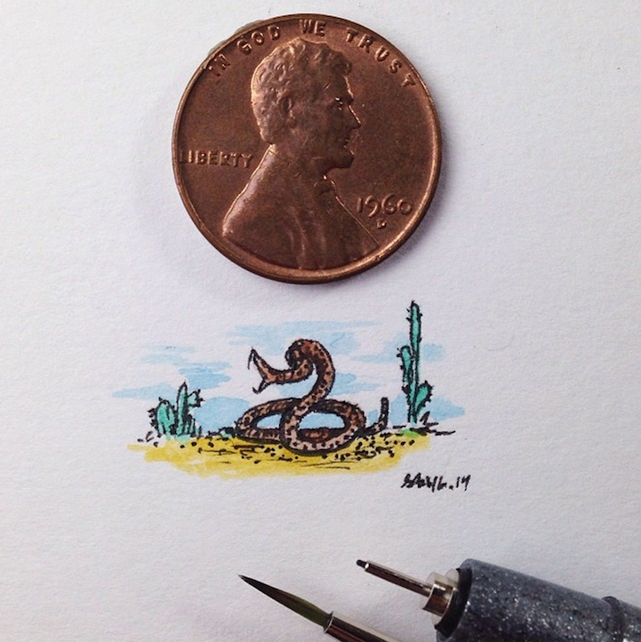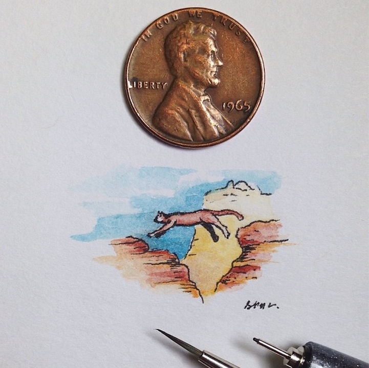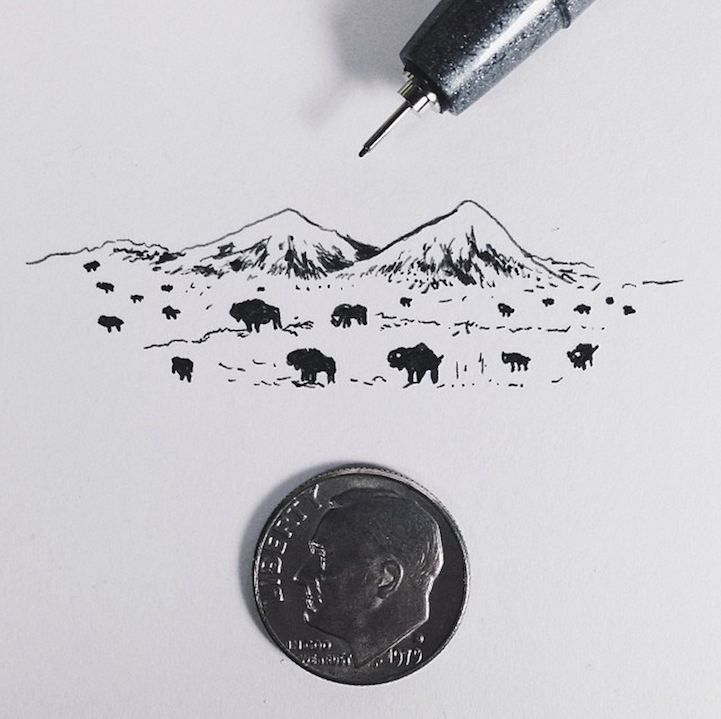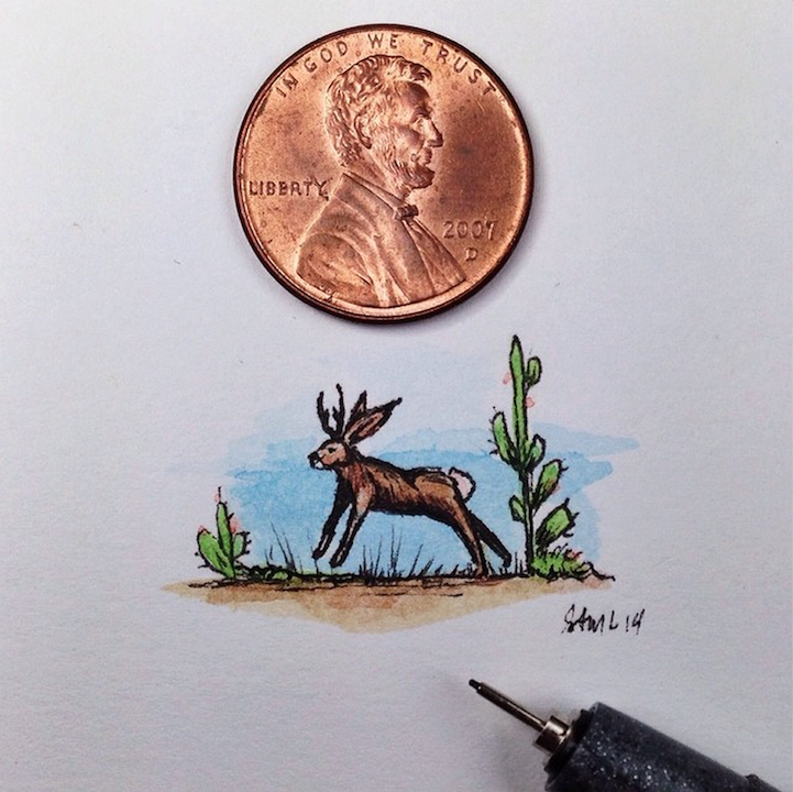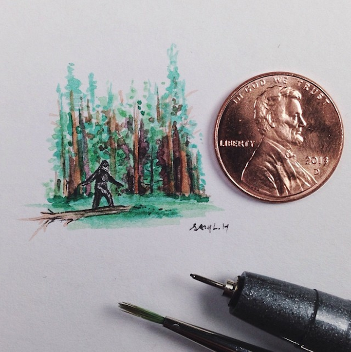 With incredible precision, California-based artist Sam Larson produces tiny illustrations that are no larger than a penny. To prove it, he places a penny right next to the drawings and documents them on Instagram.