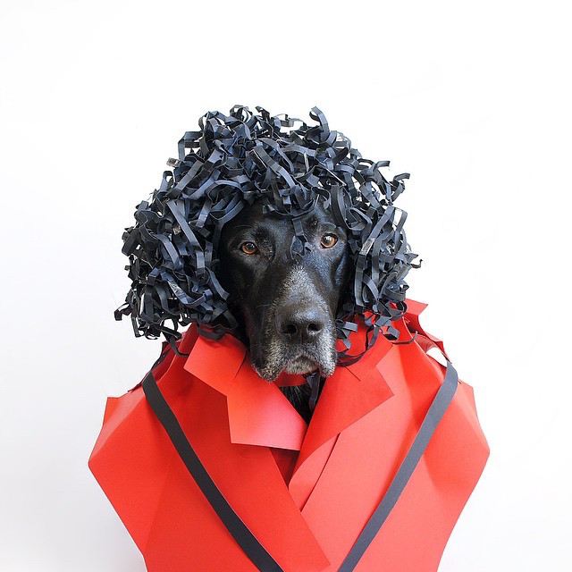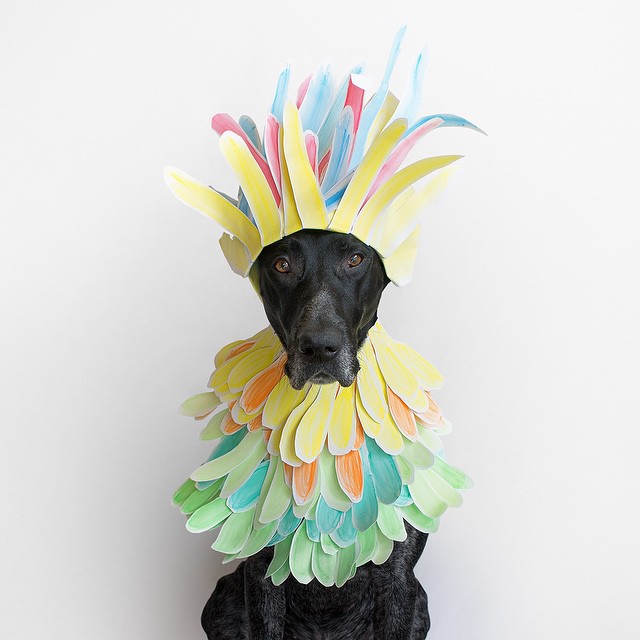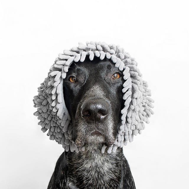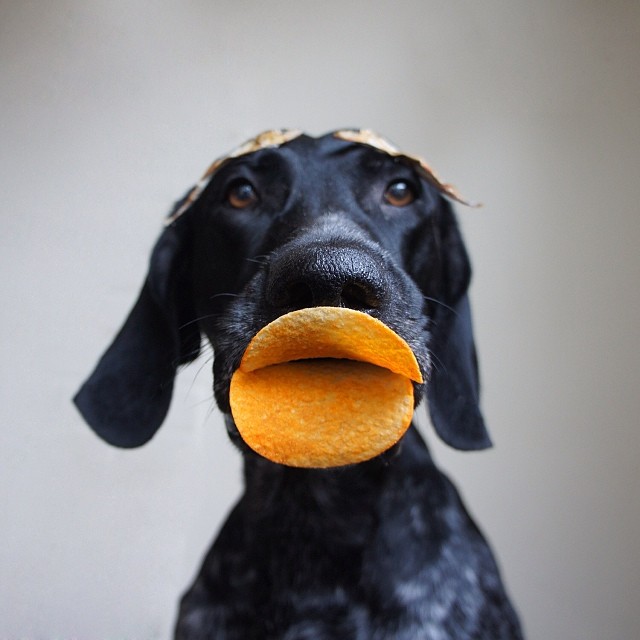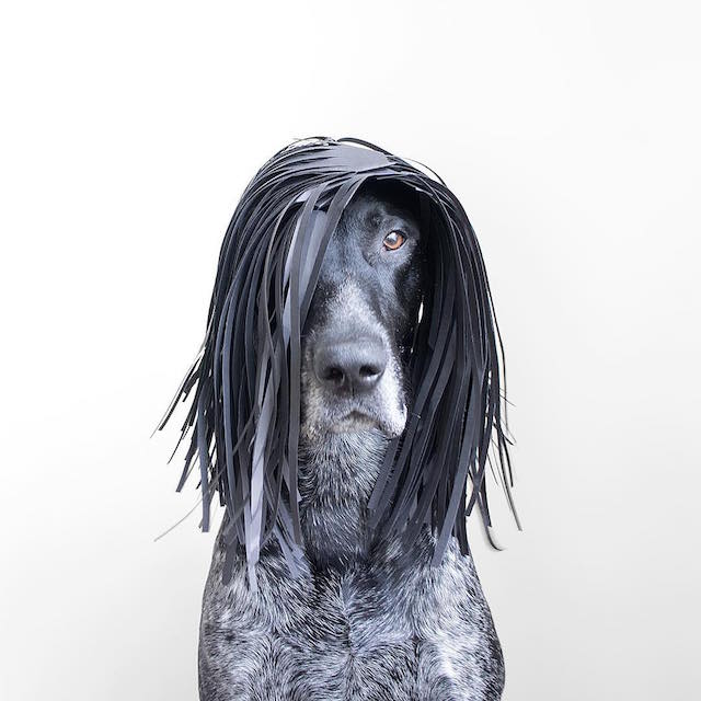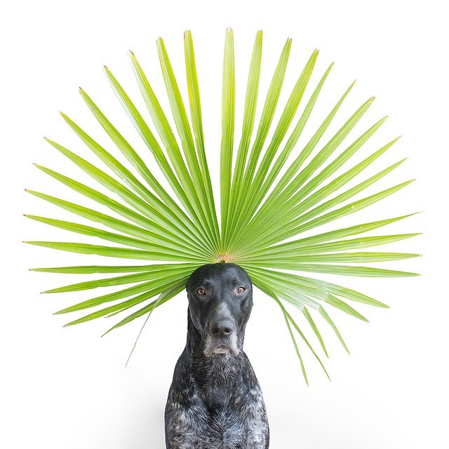 Samuel Jurcic‘s dog Lal knows a thing or two about patience. Before his owner's camera lens, the adorable German Shorthaired Pointer remains completely stoic and calm. This allows the photographer to place Lal in interesting situations involving various locations, specific poses, and many quirky props. With a hat full of tulips, the dog remains composed and flawlessly still. He's even able to balance a variety of floral, paper, and plant-based wigs atop his head. But the greatest test of comedic obedience and trust may be Lal sporting a duck mouth made from two chips, kept perfectly intact.