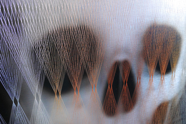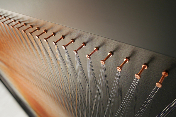 In San Pierre's Discontent series, colorful strings crisscross over black prints on composite boards. The interwoven strings are anchored by gold-plated machine nuts and bolts, creating illusions of depth and even shimmering movement. The artist soulfully describes the philosophy behind the pieces as “a personal interpretation of want and desire, highlighting the resulting inability to remain entirely satisfied and content within the present moment.”