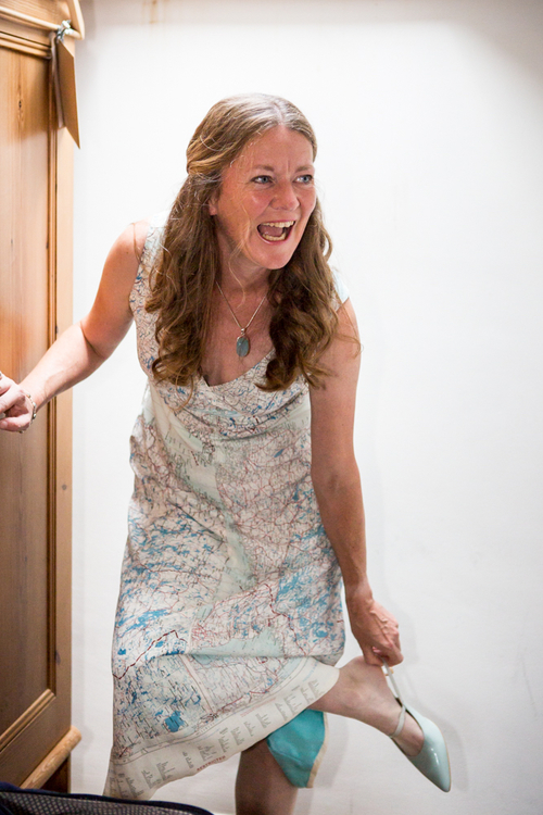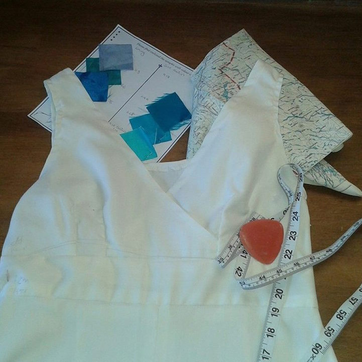 The dress was designed and crafted by Sara Jane Murray of Home Front Vintage, a business that repurposes World War II maps into crafts, accessories, and clothing. Murray first ran into Cox, a fellow artist, at a British craft fair in 2015. Captivated by Murray's map dresses, Cox requested a custom summer dress for a wedding. “‘How lovely,' I thought, ‘wearing a map dress for someone's summer wedding – let's hope she doesn't outshine the bride!'” she recalls in a blog post. Little did she know that Cox was planning on wearing the escape and evade dress to her own wedding!