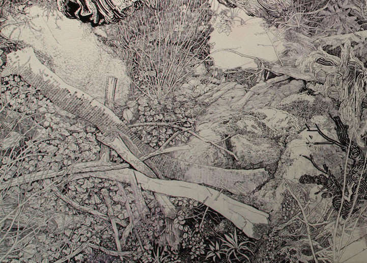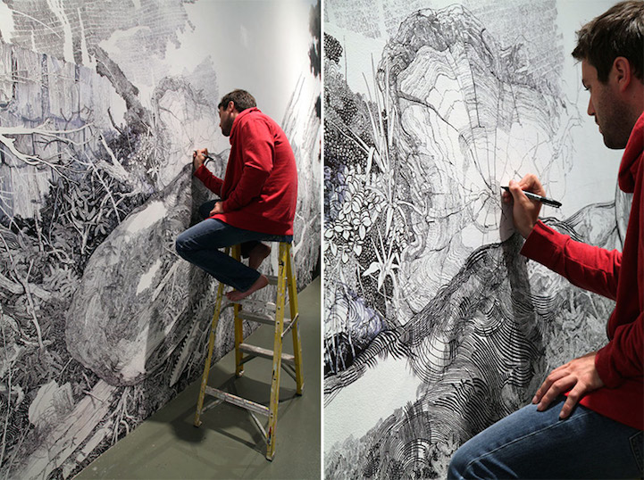 After seven long months of work, California-based artist Sean Sullivan finished Grand Pale Maw, an expansive drawing that covered the wall of a hallway in the Los Angeles Contemporary Exhibitions (LACE) gallery. Using just a black marker, the artist started drawing with the image of a fallen oak tree in his mind, but his imagination quickly took off from there as he painstakingly drew heaps of rotting wood, fallen branches, knots and fissures, wild grass and plants, bushy leaves, and even a massive whale. The amount of detail in the mural is breathtaking, as each closer look reveals another aspect of the piece.