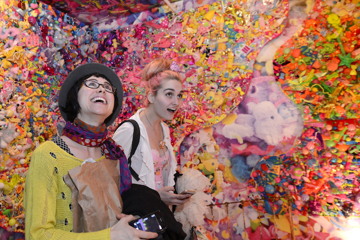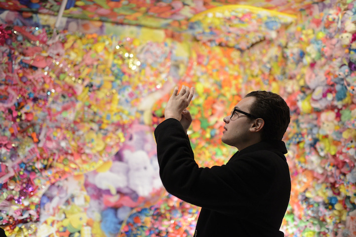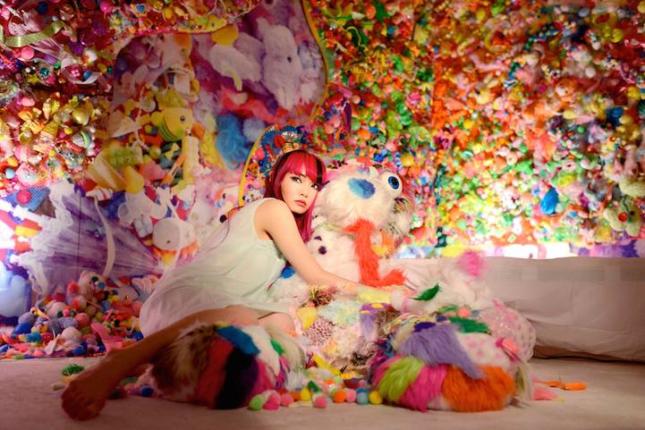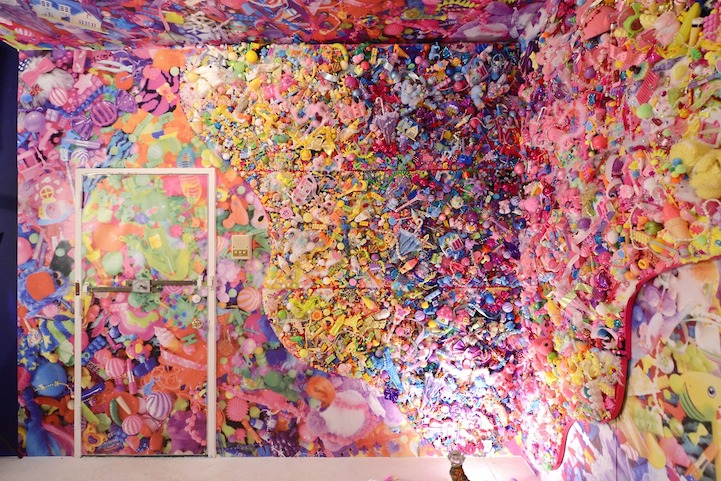 Stepping into Japanese artist Sebastian Masuda's installation Colorful Rebellion – Seventh Nightmare feels like stumbling into a wonderland that is simultaneously vividly bright, candy-sweet, and disorienting. This installation, which filled the Kianga Ellis Projects in Chelsea, New York earlier this year, features a room bursting with manufactured objects of cuteness, including bundles of fake fur, stuffed animals, plastic jewelry, girl's hair accessories, dollhouses, and other colorful toys that completely cover the walls and ceiling of the room. In the middle of the room is a bed, which visitors could lay upon and gaze up at the explosion of “Harajuku kawaii” closing in on them from every direction.