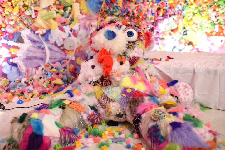Kawaii, a Japanese word that conveys multiple meanings of cute, lovely, charming, and innocent, lies at the heart of this installation. Masuda, who owns the influential Harajuku boutique 6%DOKIDOKI and has also served as an art director for kawaii superstar Kyary Pamyu Pamyu, has played a large role in popularizing kawaii culture in Japan and across the globe. According to the Kianga Ellis Projects exhibition description, “In creating a world beyond fashion, popular culture and the imagery of the iconic Harajuku girl, the artist uses unconventional materials and colorful objects associated with child's play to reveal the complexity, darkness and obsessions composing his inner world.”