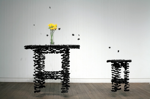 Like Jae-Hyo Lee's work, whom we've recently shared, Bahk's hanging sculptures present manufactured objects made of nature's raw materials. Many of the pieces fall under the headline An Aggregate or Existence, which is appropriate considering the construction and subject matter. The contemporary artist's collection of charcoal installations are designed to reflect upon and criticize the relationship between man and nature. There is an architectural and furniture-inspired theme present in many of the sculptures that echo man-made constructs.