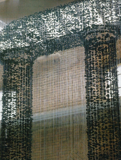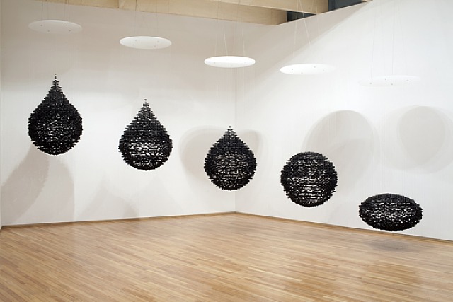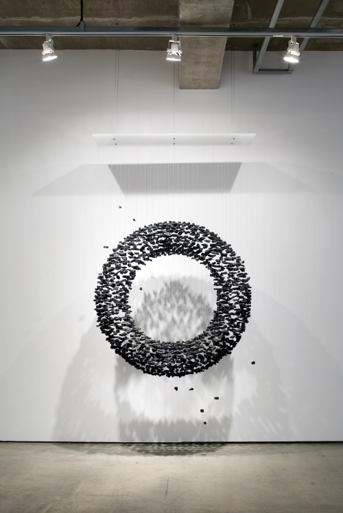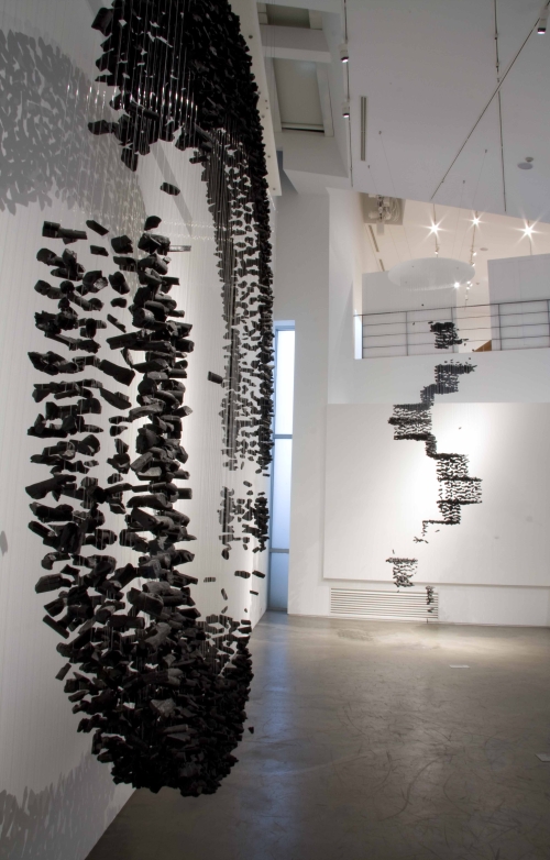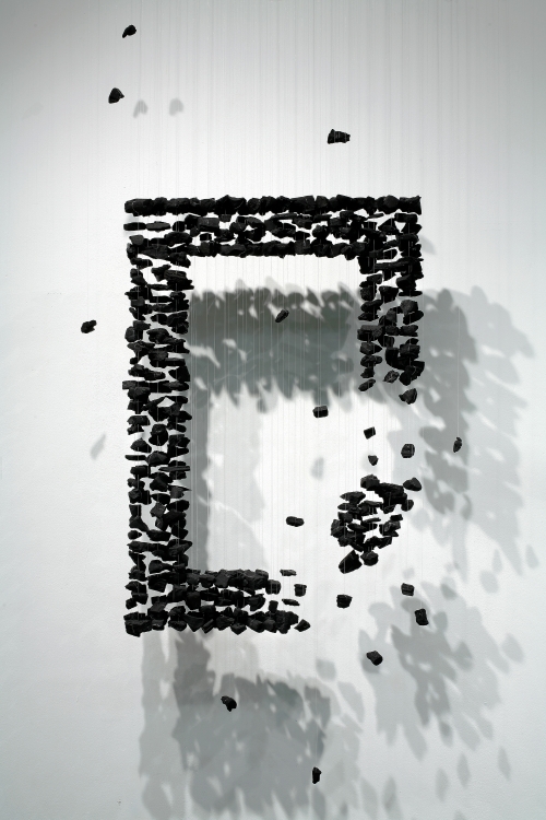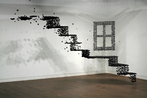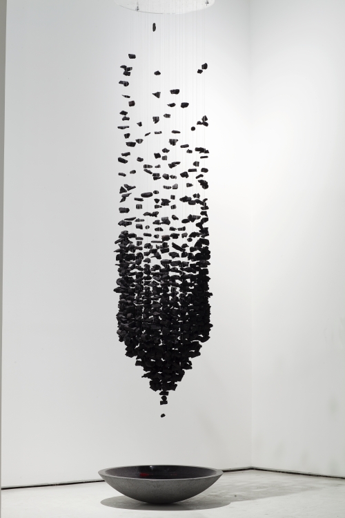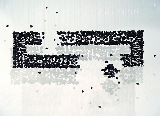 Korean artist Seon Ghi Bahk recreates man-made structures by repurposing natural resources, charcoal in particular, and suspending them with transparent nylon thread. Bahk's series of sculptural works are composed across a three-dimensional space, giving the illusion of a floating solid figure. The meticulous alignment of each lump of uniquely-shaped charcoal makes for an interestingly fragile sculpture with a coarse texture.