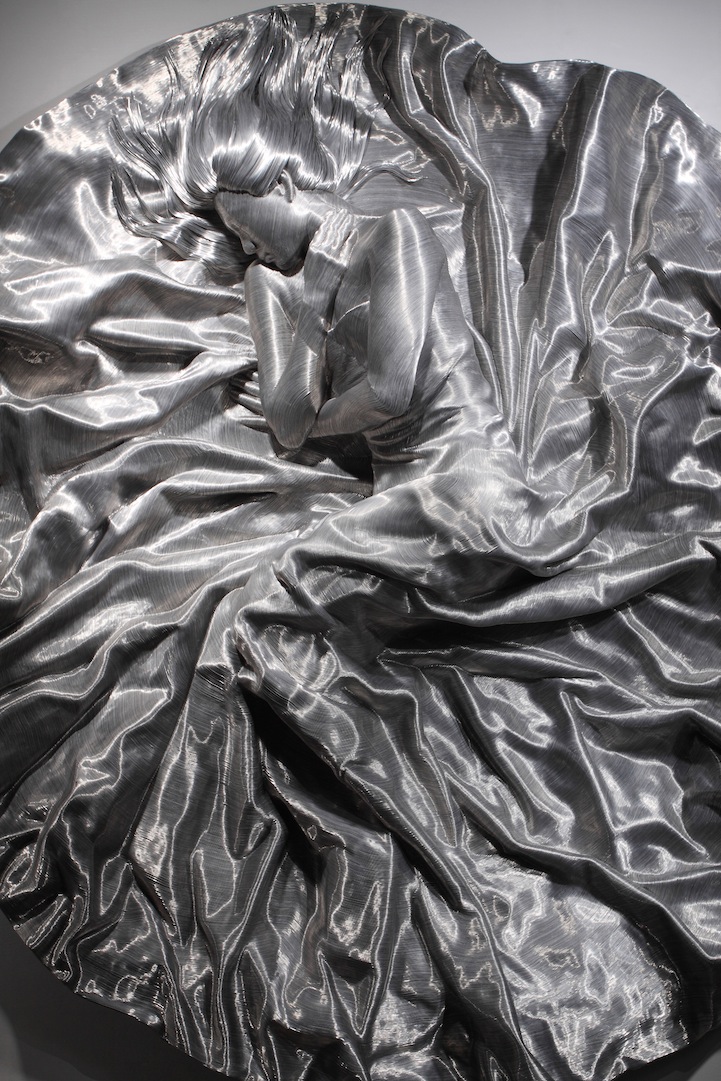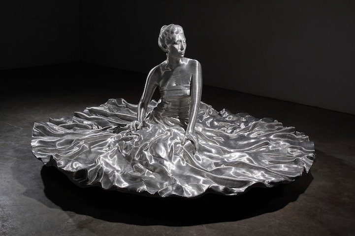 Brooklyn-based Korean sculptor Seung Mo Park creates incredibly detailed metallic sculptures by carefully manipulating aluminum wire. Each figure in his Human series of sculptures presents a remarkable attention to the delicate form of the human body (including wispy locks of hair) as well as the naturally flowing condition of draped garments.