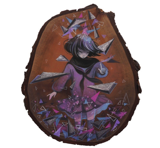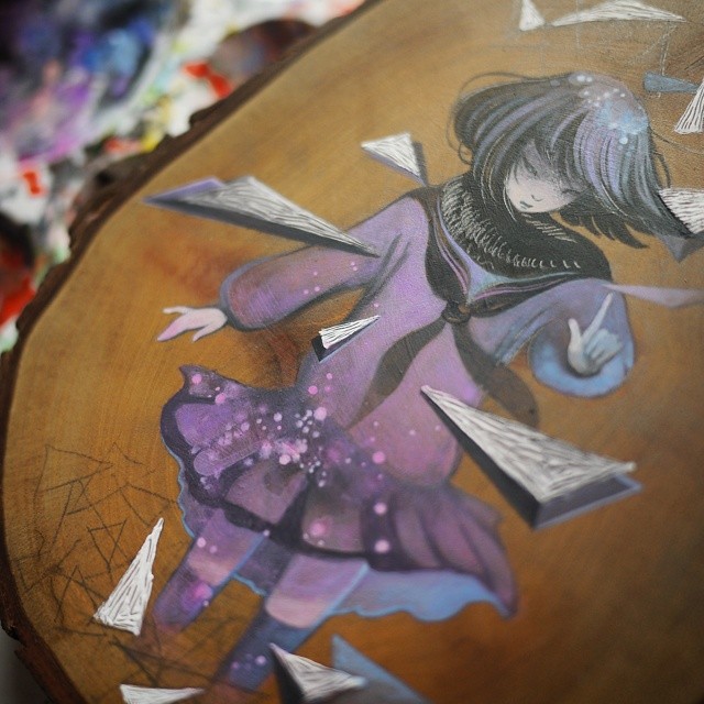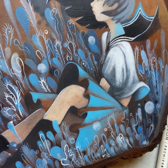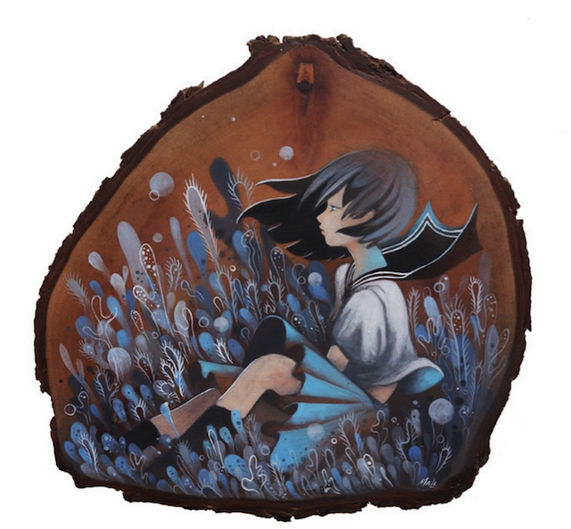 Originally from La Union, Philippines, Mall began using wood as a medium back in 2004, when she first discovered the works of Audrey Kawasaki. (One of our favorite artists!) As she tells us, “I immediately fell in love with her wood paintings. I suddenly found myself buying chopping boards, made of wood, at the local market. Working with wood as a base, I realized that it was faster and easier to paint acrylics on wood than oil on canvas; plus wood paintings look so unique and exude a warm cozy feel. Surprisingly, my first wood paintings were a hit with my clients. This success made me continue working on wood panels.”