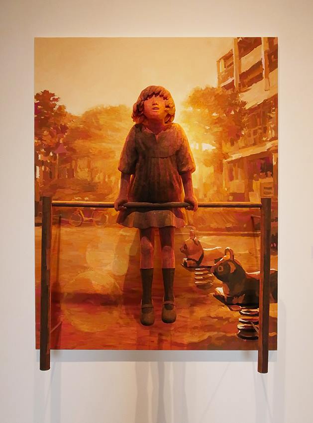 Childhood is the common theme in these two works. In the first piece, the balloon represents that feeling of an innocent time that's passed us by. As the artist tells us, “A balloon itself is nothing. However, it can be something important. We all experience that same sad feeling when a balloon suddenly sails into the sky, getting smaller and smaller as it drifts away. Although the balloon is not in our hands anymore, the feeling of it is stored in our memory.”