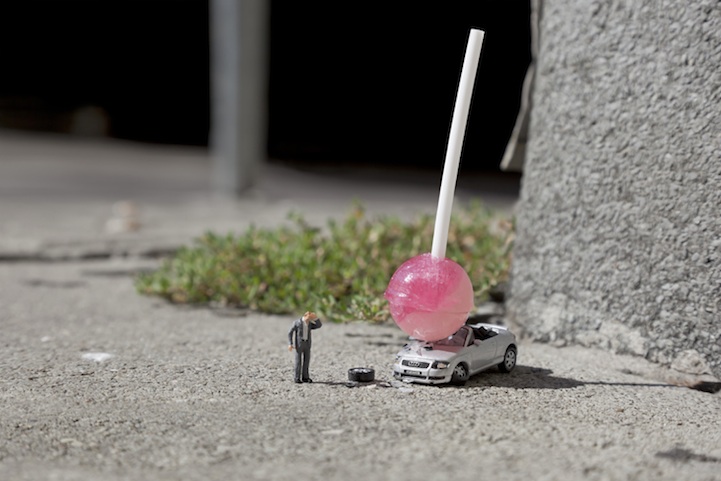 Andipa Gallery in London just sent word about the latest print release from our favorite “little people” artist Slinkachu. Called Damn Kids, it shows the owner of an Audi convertible looking quite distraught over a pink lollipop landing on his car. Talk about a catastrophe!