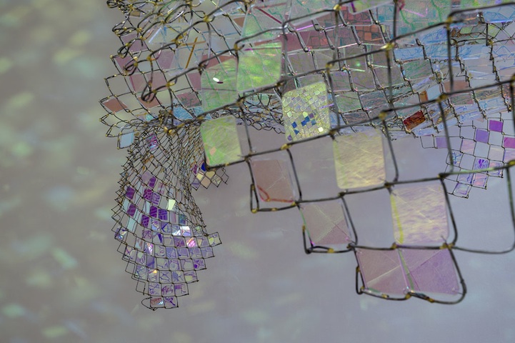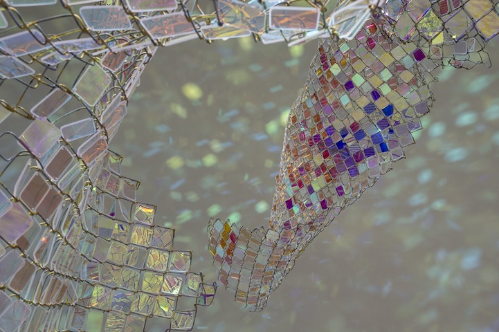 When we first came across American artist Soo Sunny Park's gorgeous sculpture, called Capturing Resonance, we were blown away by two facts. One, that it was made by chain link fencing and Plexiglas, and two, that all the different colors emanating from it were the result of light being reflected and refracted off the Plexiglas squares. As she told us then, “There are no colored plexi used in the work. It is an optical illusion, depending on the intensity of light hitting the plexi and the viewer's viewing angle, each plexi piece bounces color differently.”