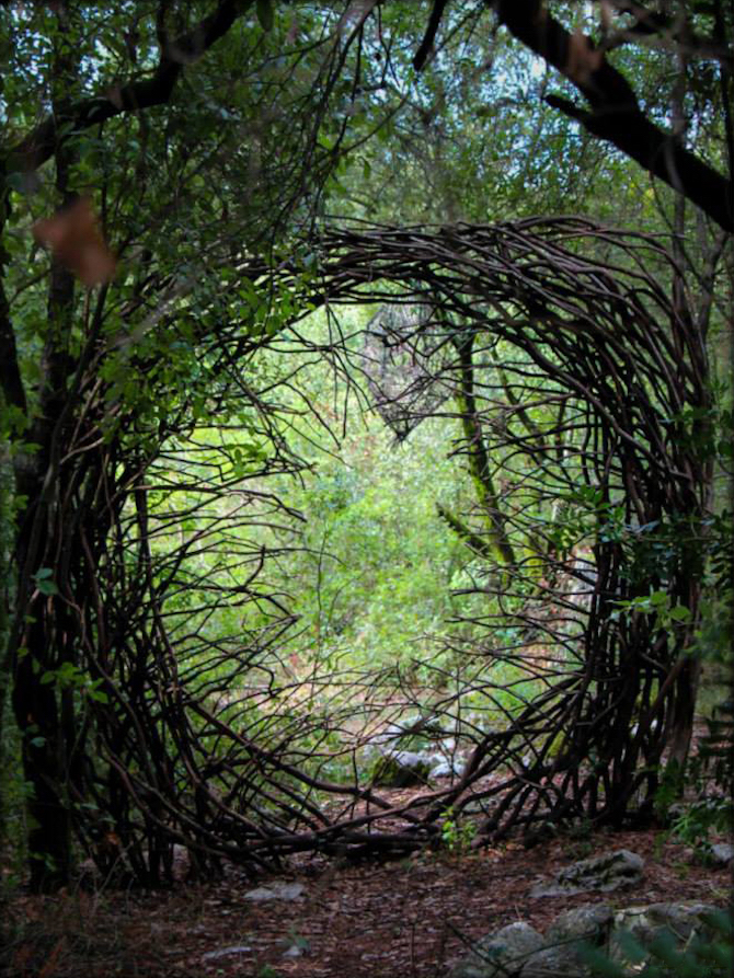 According to Byles, many people come across his sculptures by chance in the woods. Met with the sight of towering, woven structures and suspended symbols made of twined branches, the viewer may question whether the mysterious installations were formed naturally, assembled by human hands, or left in the forest by supernatural forces.