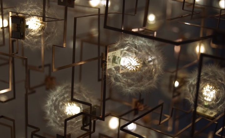Studio Drift is a company that brings together nature and technology in unique and unexpected ways. Their works encourage people to notice the little things we often take for granted or just happen to forget about. Fragile Future is a series of specially commissioned chandeliers that are made up of bronze, LED lights and actual dandelions. Real dandelion heads are arranged within a bronze structure that resembles a circuit board. This gives off the illusion that these delicate dandelions are magically floating.