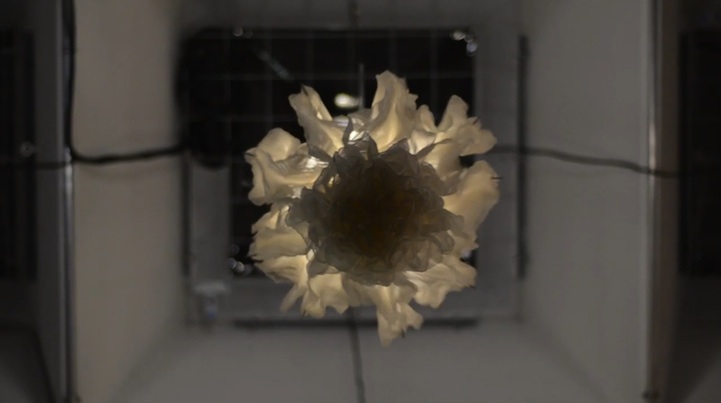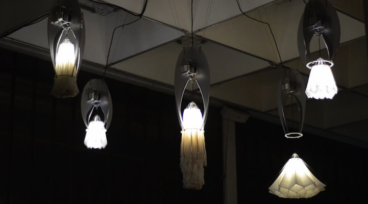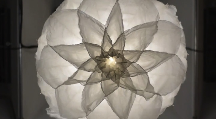 How exactly does it work? According to Studio Drift, “Shylight unfolds its blossom by a systems of springs. The shade is made out of many layers of pure silk, kept apart by arms that connect to the springs. The silk is stitched in such a structure that it dances with every movement. Gravity lets Shylight slide down and a motor controls the upward movement. The brightness of the LED and the speed of the movement are fully programmable and can be controlled by iPhone or iPad.”