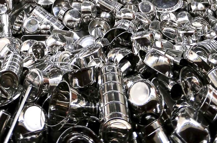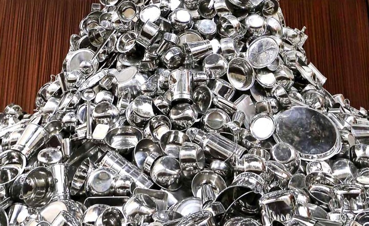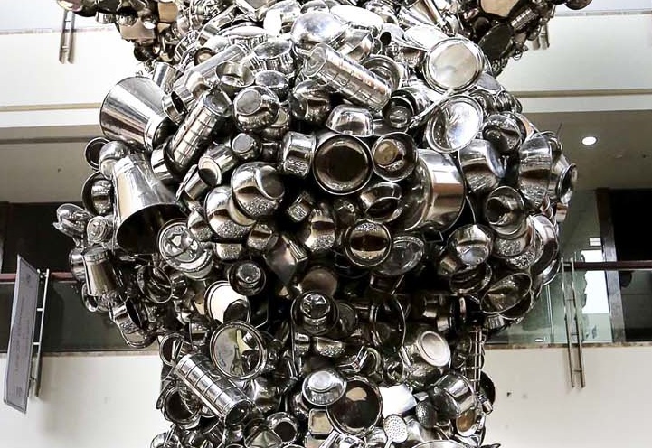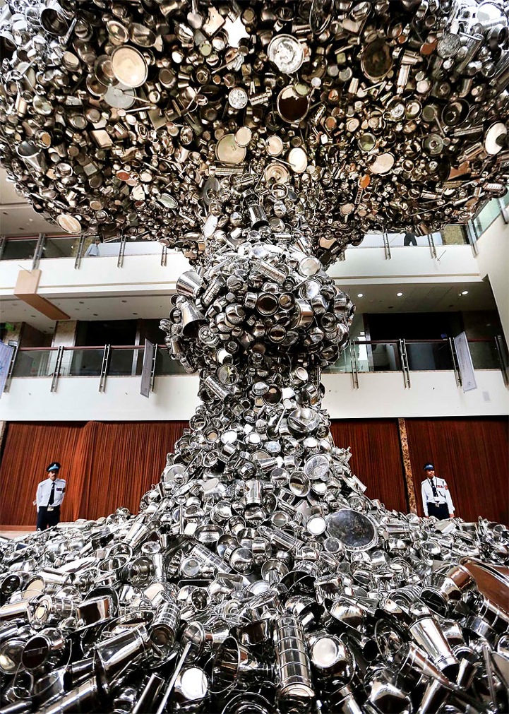 New Delhi-based Indian artist Subodh Gupta's sculptural installation titled Line of Control mimics the dismaying mushroom cloud that forms from the deployment of nuclear warfare, most historically recognized from the atomic bombings of Hiroshima and Nagasaki. The piece features 26 tons worth of stainless steel utensils, including spoons, cans, pots, and pans.