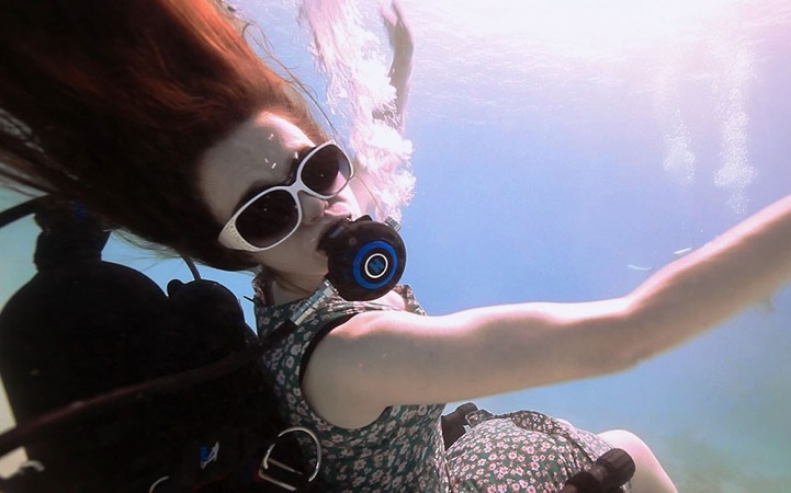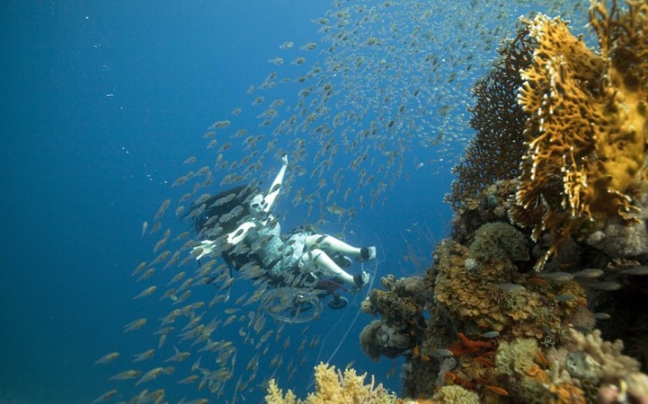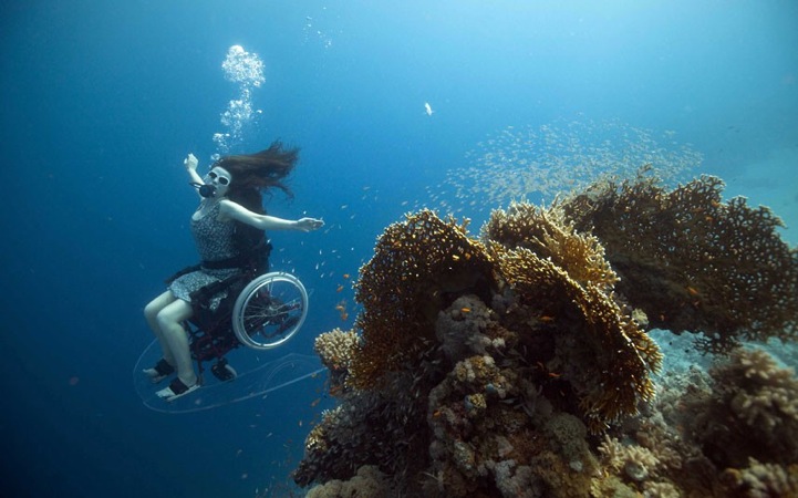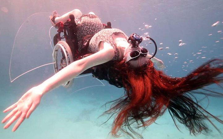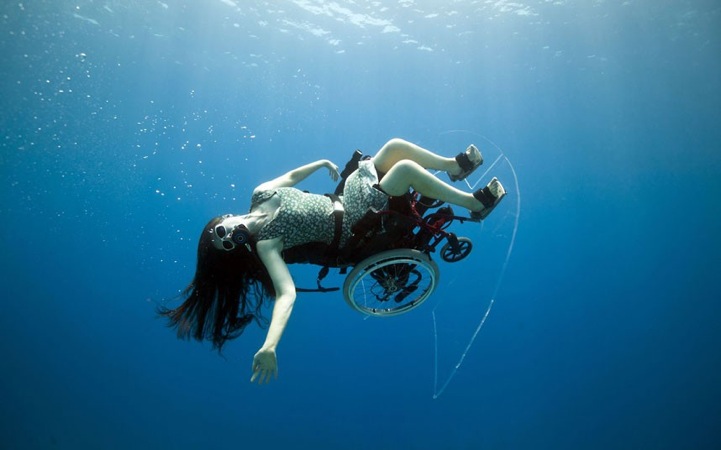 Creating the Spectacle is a body of work involving filmed and live exhibitions of her adventures under water. In this series of photographs, Austin explores the world without limitations as she swims among the fish in a self-propelled wheelchair. For months, she and a team worked together to develop a wheelchair that floats and easily glides through water. She says, “If you just put a thruster under the chair all the thrust is below the centre of gravity so you rotate. It was certainly much more acrobatic than I anticipated.” The result of her hard work are these spectacular performance-driven photographs where Austin, seated in a wheelchair, defies gravity by flipping, floating, and hanging upside-down in a majestic, underwater world.