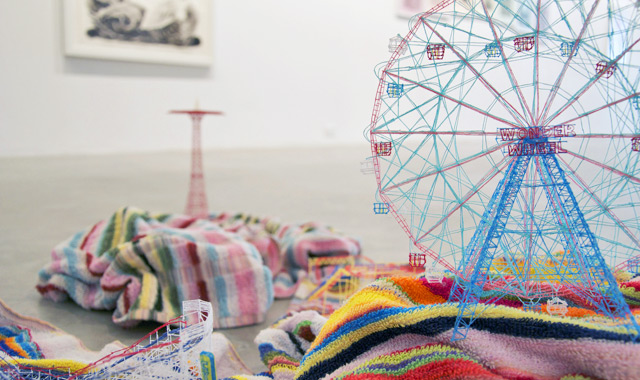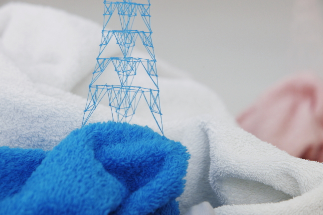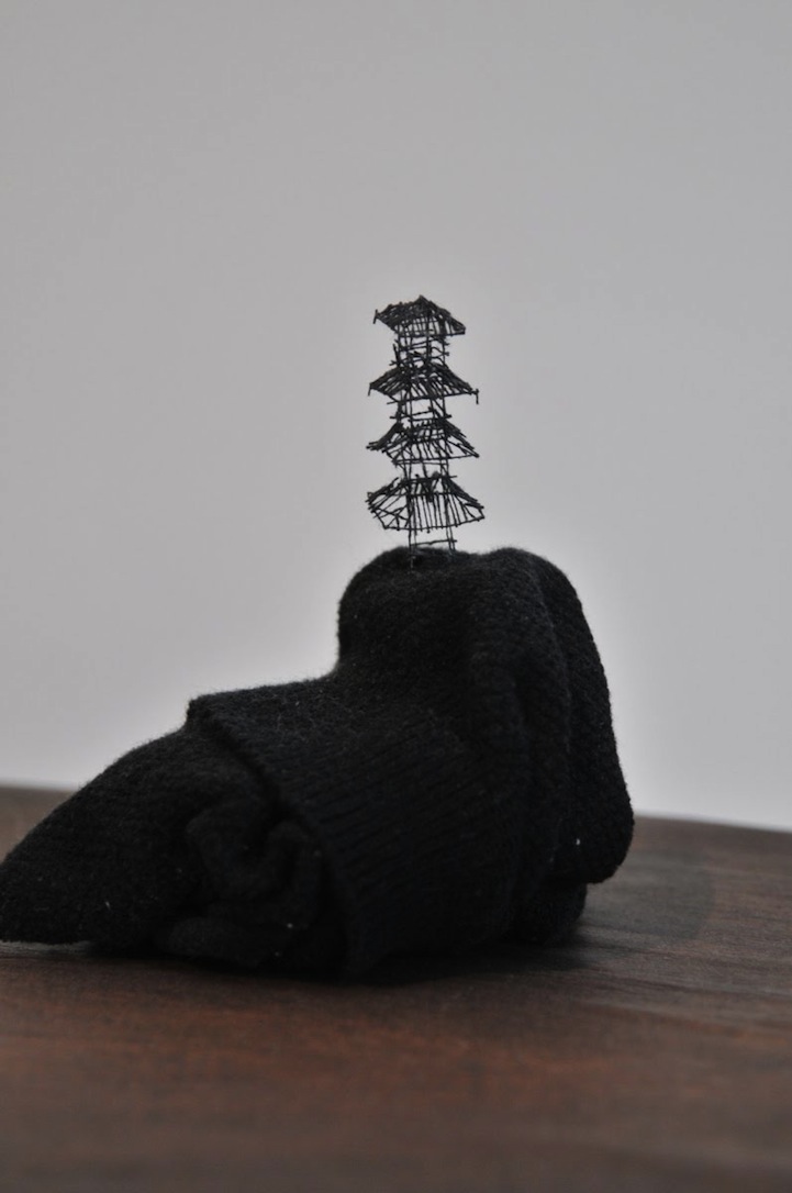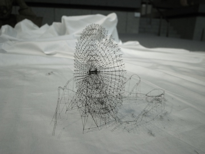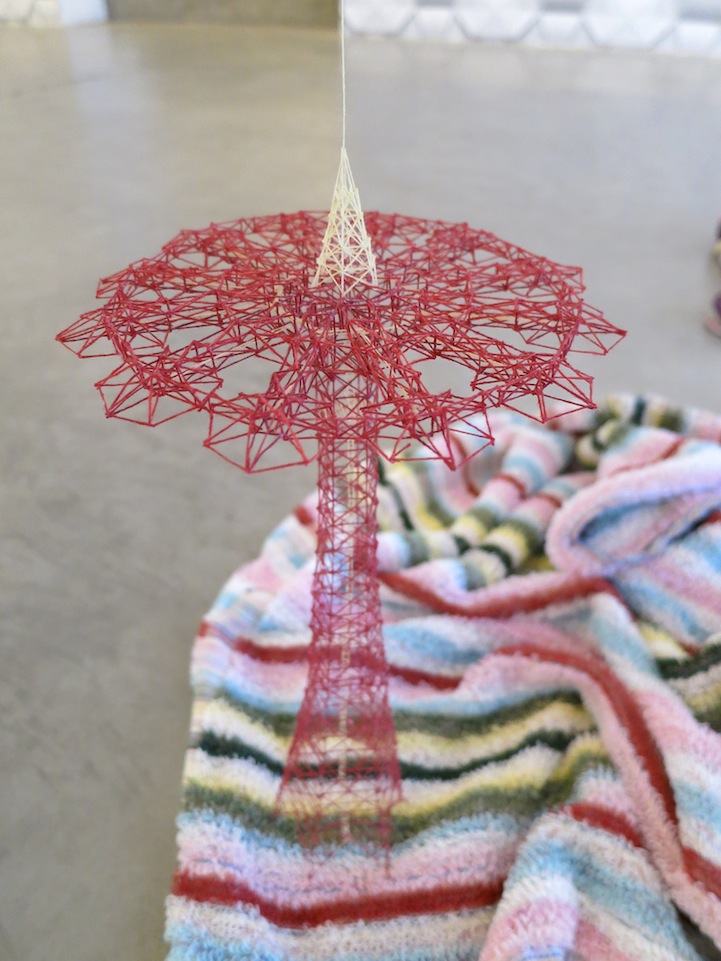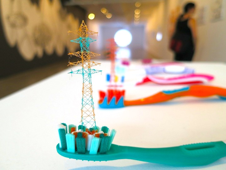 Each miniature creation by the Hiroshima-based artist is meticulously put together, awakening the viewer's senses to the many opportunities there are for art to emerge around us. Additionally, Iwasaki exposes the visual strength of materials we often presume as fragile and flimsy like thread. His work surprises audiences with the sturdiness of string by mimicking far more powerful constructs like imposingly monstrous cranes and electrical towers.