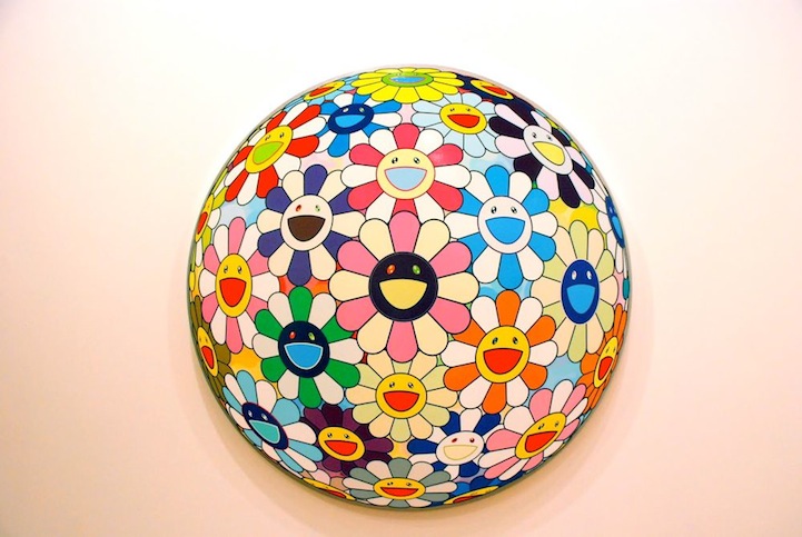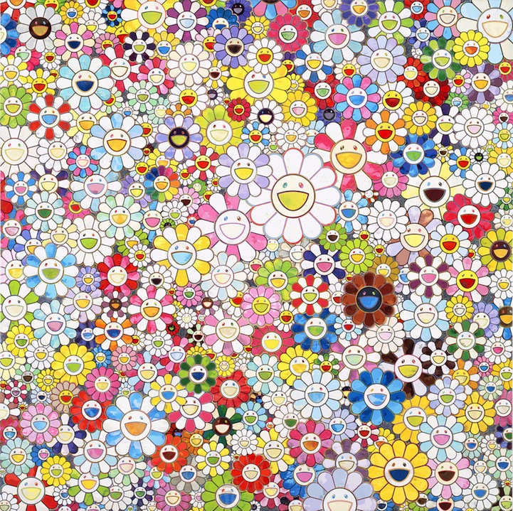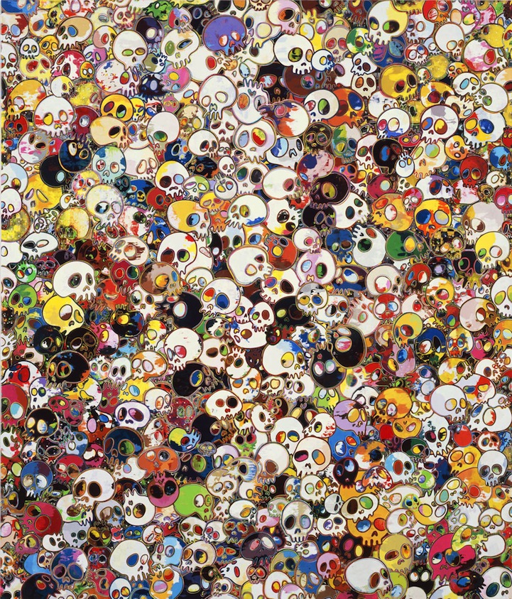 Murakami's vibrant images flourish with colorfully animated flowers. Alternatively, there is a collection of skulls depicted in his work that is equally colorful. Each figure serves as a symbol of a differing theme. While flowers often signify peace and happiness, skulls are visual triggers of death and mortality. There is an enchanting balance to the way Murakami is able to allow the opposing thematic emblems occupy the same space.