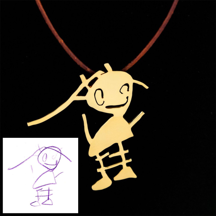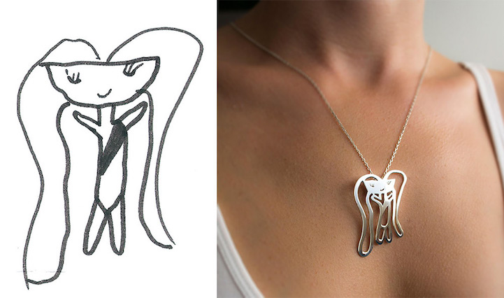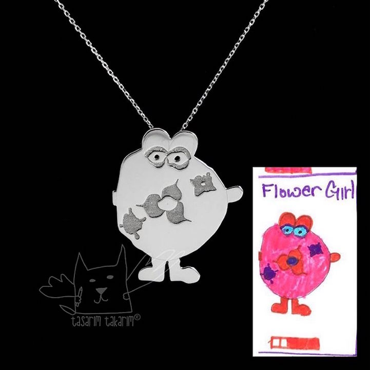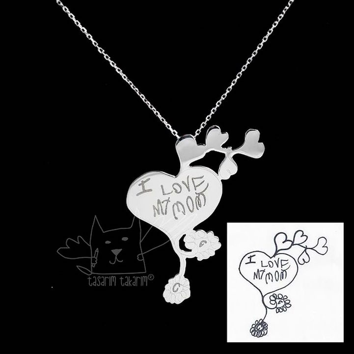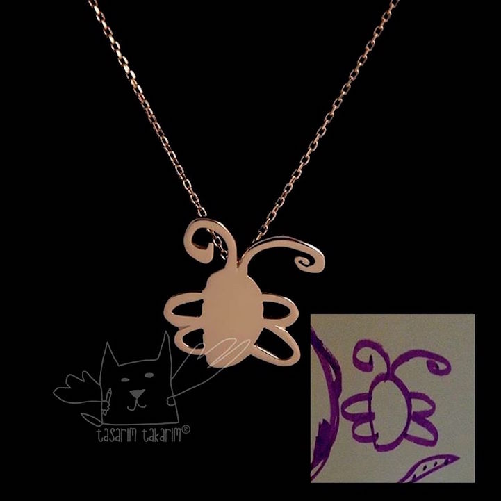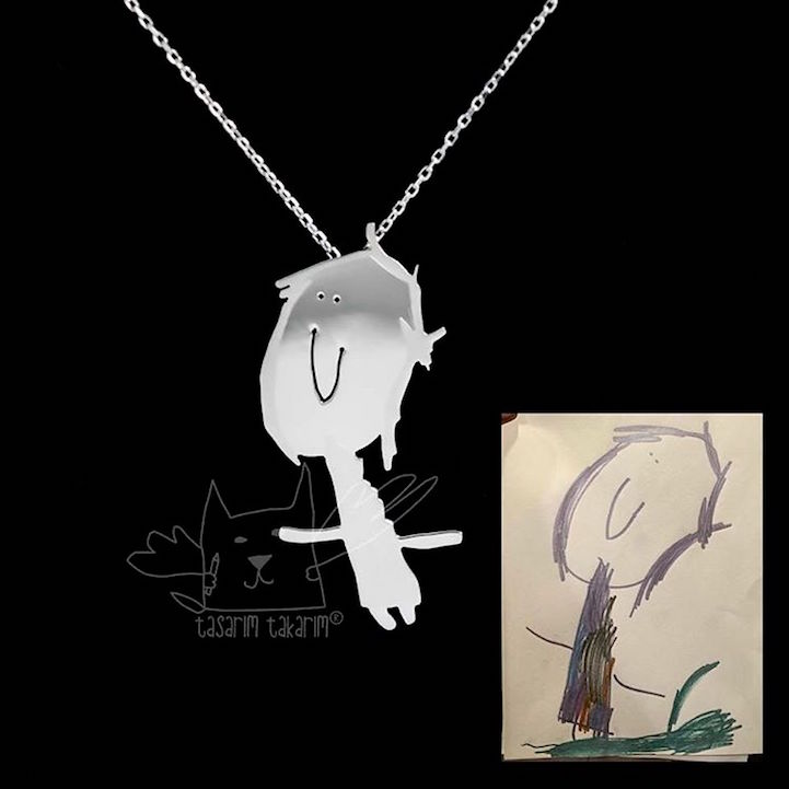 Tasarim Takarim was inspired by Istanbul-based artist Yasemin Erdin Tavukçu’s own daughter, Serin. Her artwork gave Tavukçu the idea to turn the drawings into precious wearables, and she collaborated with sculptor and goldsmith Özgür Karavit to make it a reality (whose own son, Kerem, also helped inspire their collaboration). Now, customers from all over the world send their doodles to the company. “Every drawing is unique,” Tavukçu explained to Huffington Post. “So their application solutions and their techniques are also unique.”
