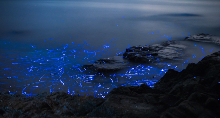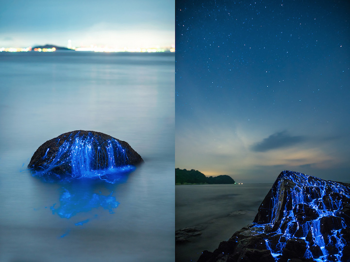 The inspiration for the series originated in 2015, when Tdub Photo—a Japanese video and photography company started by Trevor Williams and Jonathan Galione—filmed sea fireflies for the first time. The duo had shot fireflies before and took a similar approach with these subjects. “The images we shot were OK, but there was a feeling that something more could be done,” the team shared in a blog post. “This urge to do more is what drove us to create this year’s set. This set was created by pouring the ‘sea fireflies’ over rocks and points along the shore to give the impression that the stones were ‘weeping.’”