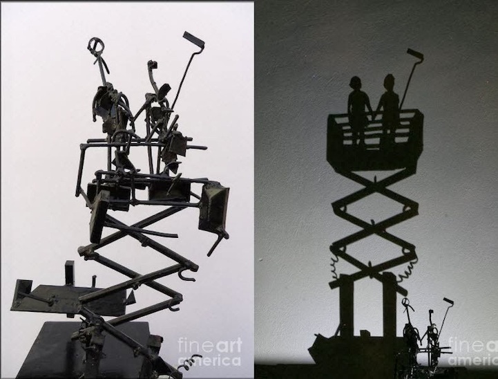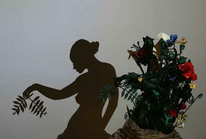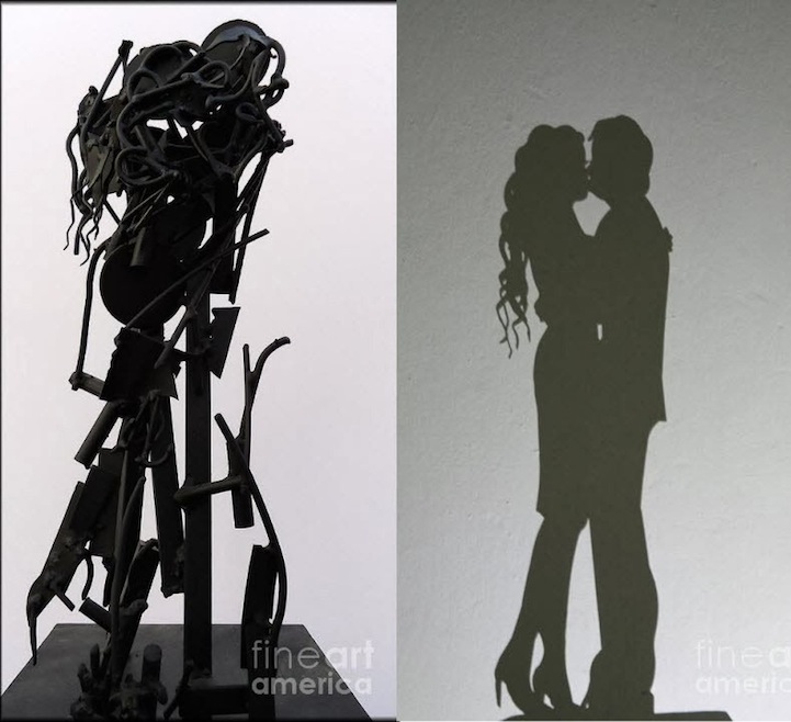 At first glance, Greek artist Tedosio Sectio Aurea's iron sculptures might seem pretty ordinary. However, when lit from the precise angle, the sculptures spring to life with shadows that reveal a whole new form. Above, a bouquet of colorful metal flowers casts a shadow of a woman holding leaves, while another sculpture features an interconnected set of 350 small, metallic balls that casts a shadow of Leonardo Da Vinci's famous sketch Viturvian Man.