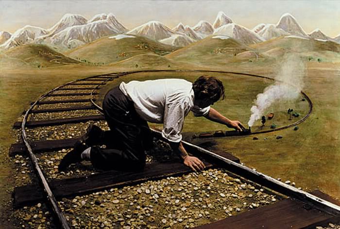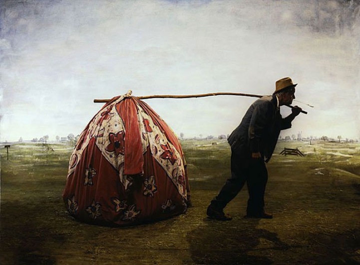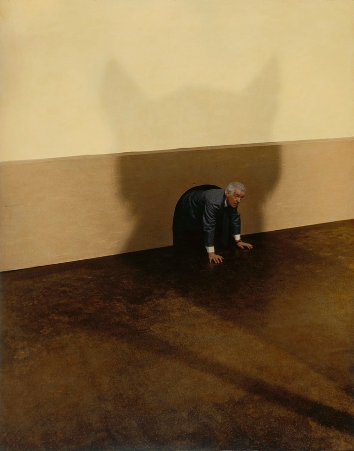 Interdisciplinary artist and photographer Teun Hocks combines his varied passions for art in his multilayered creations that lie somewhere between photographs and paintings. In an interview with ArtInfo, Hocks explains his arduous process: “There's a big backdrop that I paint or build, or whatever's needed, and I stand in the middle of that. Then I take a picture of myself in black and white and enlarge it. I do it myself in the darkroom with a little bit of help. Then I tone the picture sepia. And later I add oil paint. I color everything, but it's transparent, so that you can see the picture underneath.”