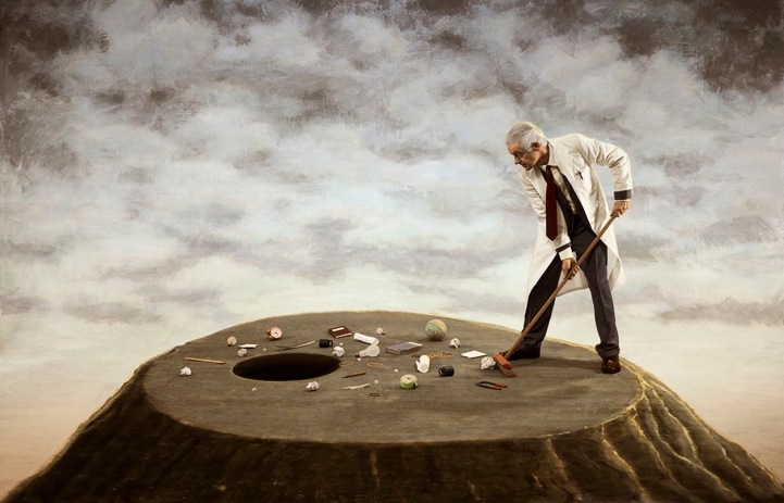 It's a lengthy technique that involves the incorporation of multiple mediums to produce each shot but, in the end, we're rewarded with some fantastically surreal depictions of an older gentleman going through the motions of life with a hefty dose of humility. Serving as both photographer and model, Hocks stands in as the subject in each of his surrealistic images, offering the diverse reactions of what some might refer to as a mid-life crisis.