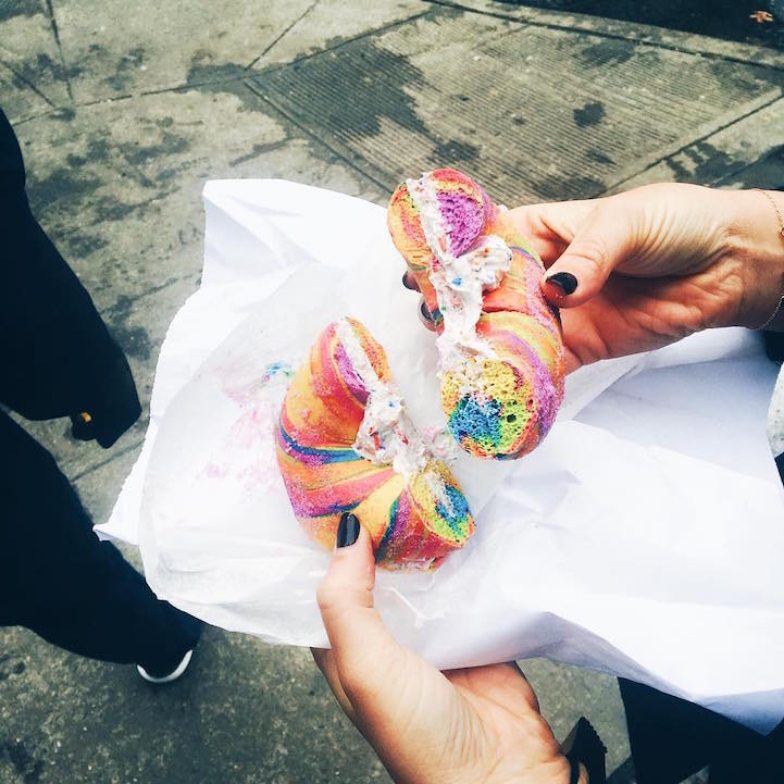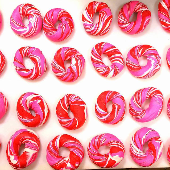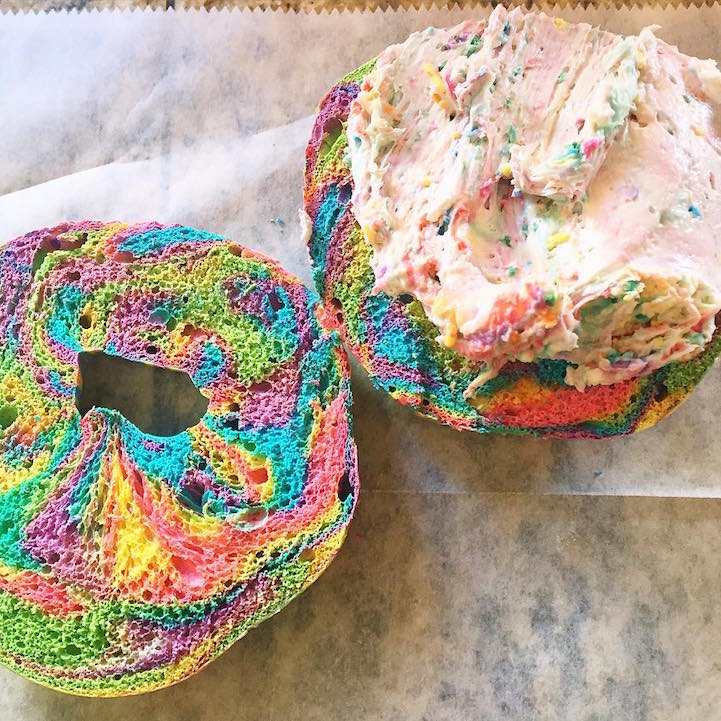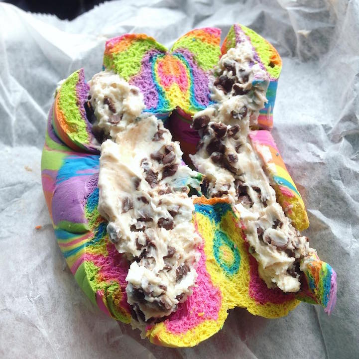 The Bagel Store is one eatery that's making a colorful splash in Brooklyn (and all over social media). For the past 20 years, bagel artist Scott Rossillo has been crafting his vanilla-flavored, rainbow bagels, which are created with a detailed, time-consuming process. In the time it normally takes to make 1,000 bagels (5 hours), Rossillo's only able to make 100 because of the dyeing, layering, and twisting that's involved. However, once this process is complete, The Bagel Store's shelves are lined with some incredibly unique bagels, which can be topped off with equally uncommon cream cheese flavors like funfetti, Nutella, and cannoli cream.