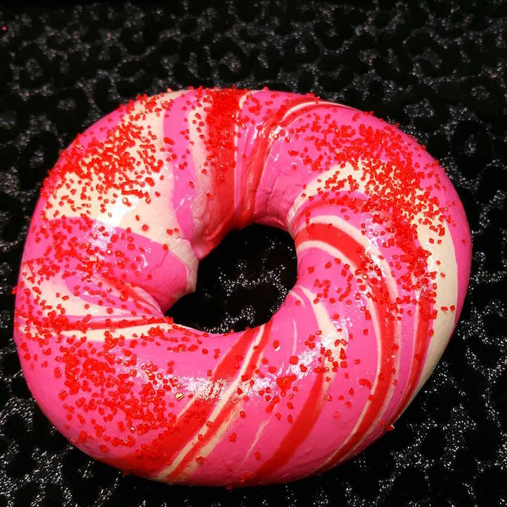 In addition to his rainbow bagels, Rossillo also creates other tasty flavors, such as seasonal favorites and those that are perfect for sports fans. There's the Denver Broncos Bagel, Carolina Panthers Bagel, Cotton Candy Bagel, and even one for Valentine's Day. There are also several selections that feature a fun, edible glitter.