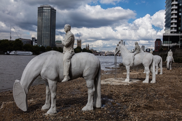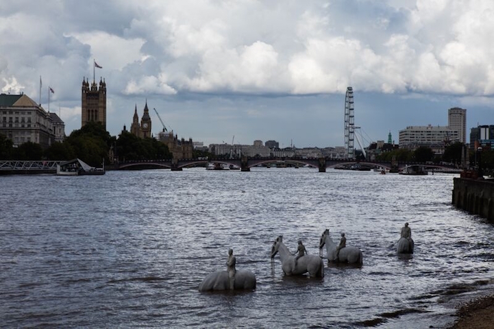 Renowned British sculptor Jason deCaires Taylor has recently brought the four horsemen of the industrial apocalypse to London, via his installation called The Rising Tide. The site-specific work features life-sized figures perched on the backs of horses, their eyes closed as they gaze out towards the Thames river bed. Their presence highlights the waterway's role in London, first as a place for commerce, trade, industry, and more recently, as a tourist attraction.