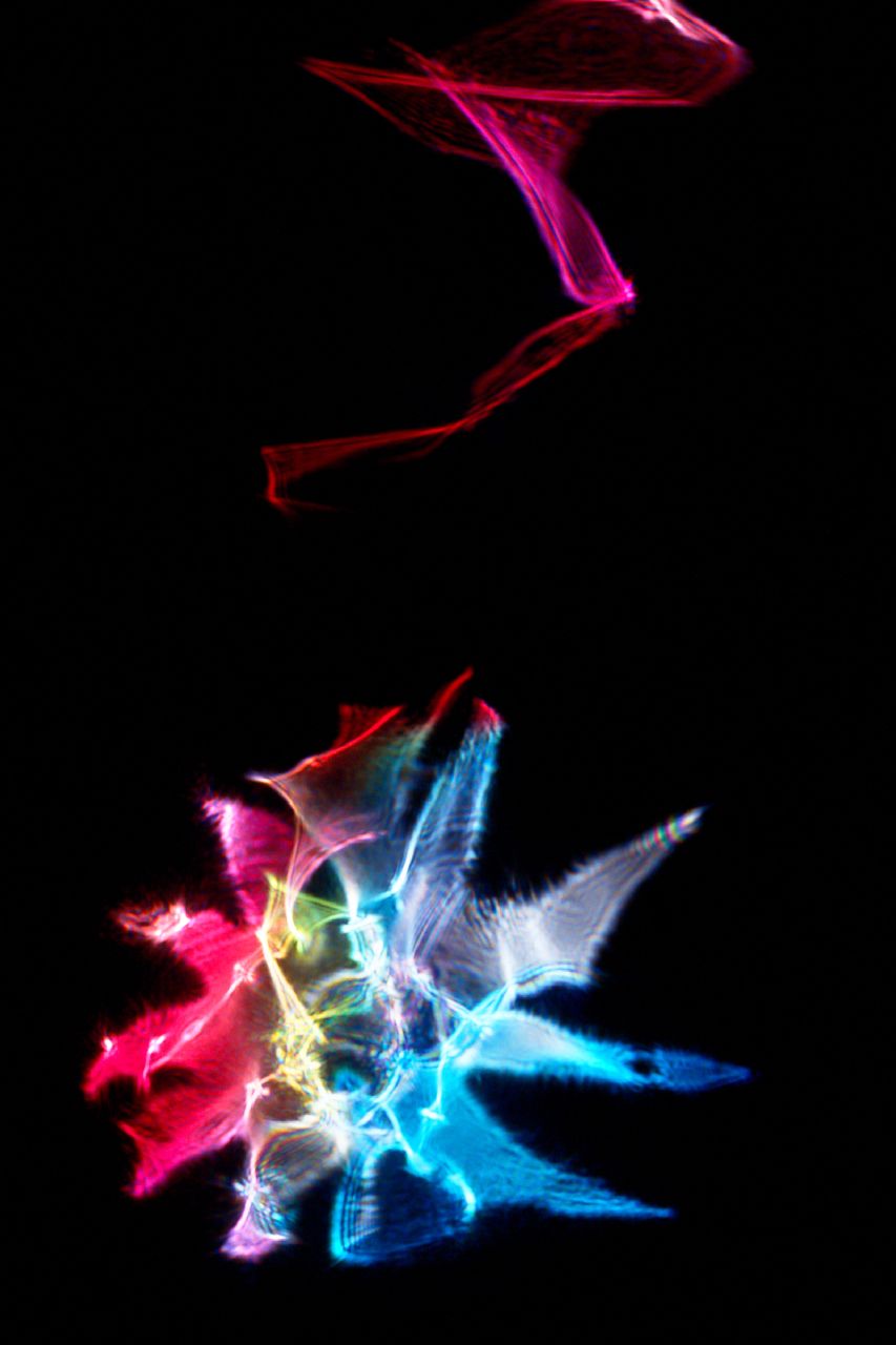 “For new viewers: These are light refraction patterns or ‘caustics' formed by a light beam passing through a shaped and textured plastic form. Colour is added into the clear plastic which modifies the way the plastic hardens further enhancing the patterns.The pattern is captured directly on to 35mm film by removing the camera lens and putting the transparent object in its place. The processed film is digitally scanned for uploading. Please note these are not computer generated images but a true analogue of the way light is refracted by the objects I create.”