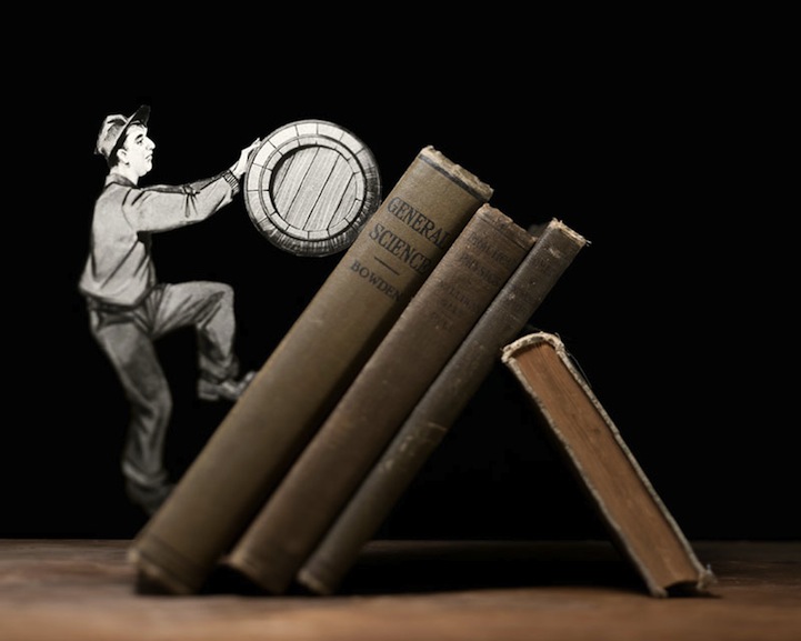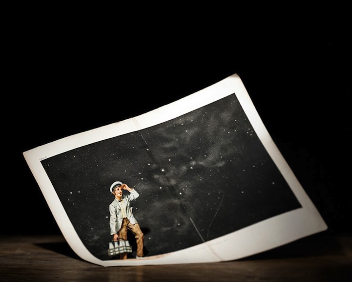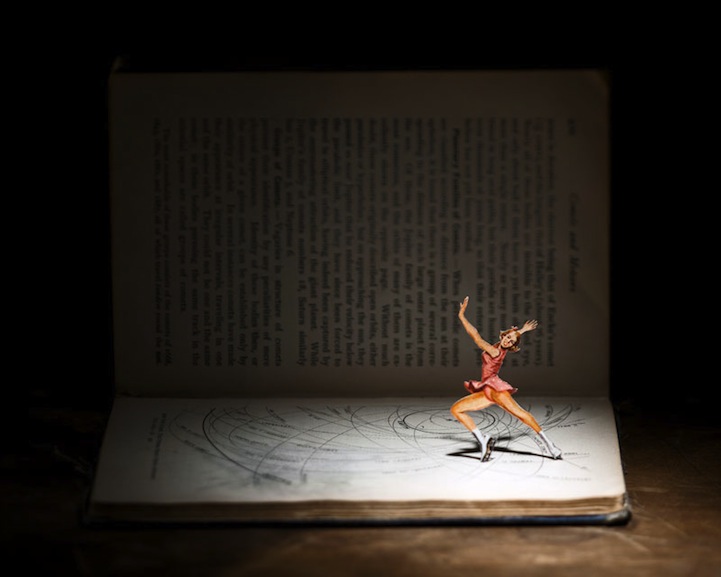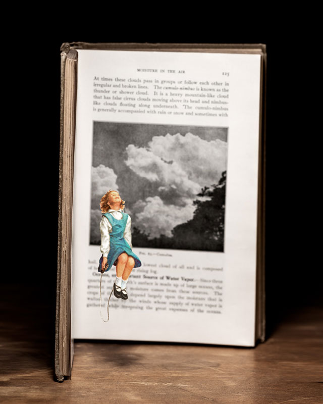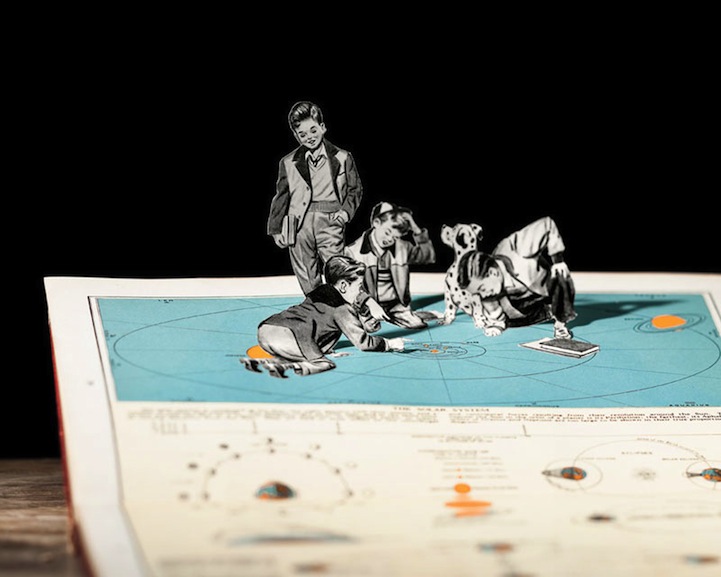 Thomas Allen brings literary characters to life in a charming diorama series of paper “dolls” cut from book illustrations. The tiny people he frees from the pages of vintage books display the innocent fashion of the 1940s and '50s. He repositions the figures in new, surprising environments: A group of schoolboys plays a game atop a solar system map, a milkman delivers bottles against a galactic backdrop, and a little girl skips rope in front of a black-and-white book page, evidently overjoyed to be unbound from the pages.