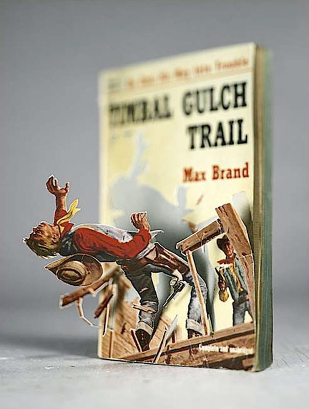 Allen drew inspiration for his project from his childhood love of View-Masters and pop-up books. He enjoys projects that visually juxtapose characters and settings. “Allen gently cuts around the shape of his figures, physically releasing them from their two-dimensional surface and then places them in a new display of meaningful interactions,” his gallery webpage explains. “His characters are brought to life from their pages and covers by detailed lighting and selective focus, ultimately telling a distinct narrative with their newly defined settings.”